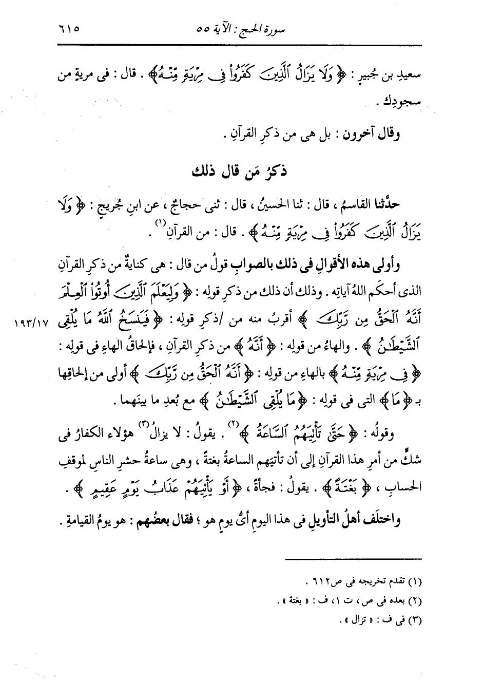 ذِكْرُ مَنْ قَالَ ذَلِكَ: حَدَّثَنَا الْقَاسِمُ، قَالَ: ثنا الْحُسَيْنُ، قَالَ: ثني حَجَّاجٌ، عَنِ ابْنِ جُرَيْجٍ: {وَلَا يَزَالُ الَّذِينَ كَفَرُوا فِي مِرْيَةٍ مِنْهُ} [الحج: 55] قَالَ: «§مِنَ الْقُرْآنِ» وَأَوْلَى هَذِهِ الْأَقْوَالُ فِي ذَلِكَ بِالصَّوَابِ، قَوْلُ مَنْ قَالَ: هِيَ كِنَايَةٌ مِنْ ذِكْرِ الْقُرْآنِ الَّذِي أَحْكَمَ اللَّهُ آيَاتِهِ؛ وَذَلِكَ أَنَّ ذَلِكَ مِنْ ذِكْرِ قَوْلُهُ: {وَلِيَعْلَمَ الَّذِينَ أُوتُوا الْعِلْمَ أَنَّهُ الْحَقُّ مِنْ رَبِّكَ} [الحج: 54] أَقْرَبُ مِنْهُ مِنْ ذِكْرِ قَوْلُهُ: {فَيَنْسَخُ اللَّهُ مَا يُلْقِي الشَّيْطَانُ} [الحج: 52] وَالْهَاءُ مِنْ قَوْلِهِ {أَنَّهُ} [الحج: 54] مِنْ ذِكْرِ الْقُرْآنِ، فَإِلْحَاقُ الْهَاءِ فِي قَوْلِهِ: {فِي مِرْيَةٍ مِنْهُ} [هود: 17] بِالْهَاءِ مِنْ قَوْلِهِ: {أَنَّهُ الْحَقُّ مِنْ رَبِّكَ} [الحج: 54] أَوْلَى مِنْ إِلْحَاقِهَا بِـ (مَا) الَّتِي فِي قَوْلِهِ {مَا يُلْقِي الشَّيْطَانُ} [الحج: 52] مَعَ بُعْدِ مَا بَيْنَهُمَا