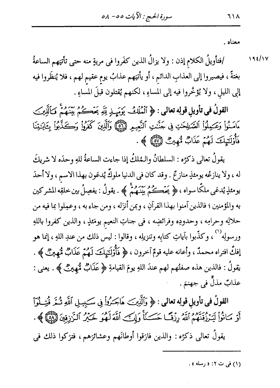 §الْقَوْلُ فِي تَأْوِيلِ قَوْلِهِ تَعَالَى: {الْمُلْكُ يَوْمَئِذٍ لِلَّهِ يَحْكُمُ بَيْنَهُمْ فَالَّذِينَ آمَنُوا وَعَمِلُوا الصَّالِحَاتِ فِي جَنَّاتِ النَّعِيمِ وَالَّذِينَ كَفَرُوا وَكَذَّبُوا بِآيَاتِنَا فَأُولَئِكَ لَهُمْ عَذَابٌ مُهِينٌ} [الحج: 57] يَقُولُ تَعَالَى ذِكْرُهُ: السُّلْطَانُ وَالْمُلْكُ إِذَا جَاءَتِ السَّاعَةُ لِلَّهِ وَحْدَهُ لَا شَرِيكَ لَهُ , وَلَا يُنَازِعُهُ يَوْمَئِذٍ مُنَازِعٌ، وَقَدْ كَانَ فِي الدُّنْيَا مُلُوكٌ يُدْعَوْنَ بِهَذَا الِاسْمِ , وَلَا أَحَدَ يَوْمَئِذٍ يُدْعَى مَلِكًا سِوَاهُ. {يَحْكُمُ بَيْنَهُمْ} [البقرة: 113] يَقُولُ: يَفْصِلُ بَيْنَ خَلْقِهِ الْمُشْرِكِينَ بِهِ وَالْمُؤْمِنِينَ. {فَالَّذِينَ آمَنُوا} [الأعراف: 157] بِهَذَا الْقُرْآنِ، وَبِمَنْ أَنْزَلَهُ، وَمَنْ جَاءَ بِهِ، وَعَمِلُوا بِمَا فِيهِ مِنْ حَلَالِهِ , وَحَرَامِهِ , وَحُدُودِهِ وَفَرَائِضِهِ {فِي جَنَّاتِ النَّعِيمِ} [يونس: 9] يَوْمَئِذٍ. {وَالَّذِينَ كَفَرُوا} [البقرة: 39] بِاللَّهِ وَرَسُولِهِ، {وَكَذَّبُوا} [البقرة: 39] بِآيَاتِ كِتَابِهِ وَتَنْزِيلِهِ، وَقَالُوا: لَيْسَ ذَلِكَ مِنْ عِنْدِ اللَّهِ، إِنَّمَا هُوَ إِفْكٌ افْتَرَاهُ مُحَمَّدٌ , وَأَعَانَهُ عَلَيْهِ قَوْمٌ آخَرُونَ {فَأُولَئِكَ لَهُمْ عَذَابٌ مُهِينٌ} [الحج: 57] . يَقُولُ: فَالَّذِينَ هَذِهِ صِفَتُهُمْ لَهُمْ عِنْدَ اللَّهِ يَوْمَ الْقِيَامَةِ عَذَابٌ مُهِينٌ، يَعْنِي عَذَابٌ مُذِلٌّ فِي جَهَنَّمَ