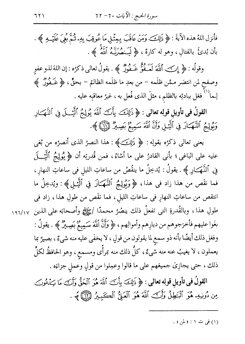 §الْقَوْلُ فِي تَأْوِيلِ قَوْلِهِ تَعَالَى: {ذَلِكَ بِأَنَّ اللَّهَ يُولِجُ اللَّيْلَ فِي النَّهَارِ وَيُولِجُ النَّهَارَ فِي اللَّيْلِ} [الحج: 61] يَعْنِي تَعَالَى ذِكْرُهُ بِقَوْلِهِ: {ذَلِكَ} [البقرة: 2] هَذَا النَّصْرُ الَّذِي أَنْصُرُهُ عَلَى مَنْ بُغِيَ عَلَيْهِ عَلَى الْبَاغِي، لِأَنِّي الْقَادِرُ عَلَى مَا أَشَاءُ. فَمِنْ قُدْرَتِهِ أَنَّ اللَّهَ {يُولِجُ اللَّيْلَ فِي النَّهَارِ} [الحج: 61] يَقُولُ: يُدْخِلُ مَا يَنْقُصُ مِنْ سَاعَاتِ اللَّيْلِ فِي سَاعَاتِ النَّهَارِ، فَمَا نَقَصَ مِنْ هَذَا زَادَ فِي هَذَا {وَيُولِجُ النَّهَارَ فِي اللَّيْلِ} [الحج: 61] وَيُدْخِلُ مَا انْتَقَصَ مِنْ سَاعَاتِ النَّهَارِ فِي سَاعَاتِ اللَّيْلِ، فَمَا نَقَصَ مِنْ طُولِ هَذَا زَادَ فِي طُولِ هَذَا، وَبِالْقُدْرَةِ الَّتِي يَفْعَلُ ذَلِكَ يَنْصُرُ مُحَمَّدًا صَلَّى اللهُ عَلَيْهِ وَسَلَّمَ وَأَصْحَابَهُ عَلَى الَّذِينَ بَغَوْا عَلَيْهِمْ , فَأَخْرَجُوهُمْ مِنْ دِيَارِهِمْ وَأَمْوَالِهِمْ. يَقُولُ: وَفَعَلَ ذَلِكَ أَيْضًا بِأَنَّهُ ذُو سَمْعٍ لِمَا يَقُولُونَ مِنْ قَوْلٍ , لَا يَخْفَى عَلَيْهِ مِنْهُ شَيْءٌ، بَصِيرٌ بِمَا يَعْمَلُونَ، لَا يَغِيبُ عَنْهُ مِنْهُ شَيْءٌ، كُلُّ ذَلِكَ مَعَهُ بِمَرْأًى وَمَسْمَعٍ، وَهُوَ الْحَافِظُ لِكُلِّ ذَلِكَ، حَتَّى يُجَازِي جَمِيعَهُمْ عَلَى مَا قَالُوا وَعَمِلُوا مِنْ قَوْلٍ وَعَمَلٍجَزَاءَهُ