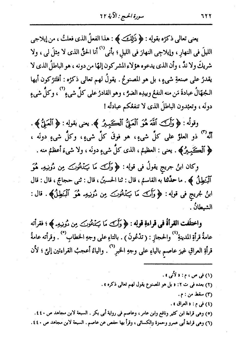 مَا: حَدَّثَنَا الْقَاسِمُ، قَالَ: ثنا الْحُسَيْنُ، قَالَ: ثني حَجَّاجٌ قَالَ: قَالَ ابْنُ جُرَيْجٍ، فِي قَوْلِهِ: {وَأَنَّ مَا يَدْعُونَ مِنْ دُونِهِ هُوَ الْبَاطِلُ} [الحج: 62] قَالَ: «§الشَّيْطَانُ» وَاخْتَلَفَتِ الْقُرَّاءُ فِي قِرَاءَةِ قَوْلِهِ: {وَأَنَّ مَا يَدْعُونَ مِنْ دُونِهِ} [الحج: 62] فَقَرَأَتْهُ عَامَّةُ قُرَّاءِ الْعِرَاقِ وَالْحِجَازِ: (تَدْعُونَ) بِالتَّاءِ عَلَى وَجْهِ الْخَطَّابِ؛ وَقَرَأَتْهُ عَامَّةُ قُرَّاءِ الْعِرَاقِ غَيْرَ عَاصِمٍ بِالْيَاءِ عَلَى وَجْهِ الْخَبَرِ، وَالْيَاءُ أَعْجَبُ الْقِرَاءَتَيْنِ إِلَيَّ، لِأَنَّ -[623]- ابْتِدَاءَ الْخَبَرِ عَلَى وَجْهِ الْخَطَّابِ