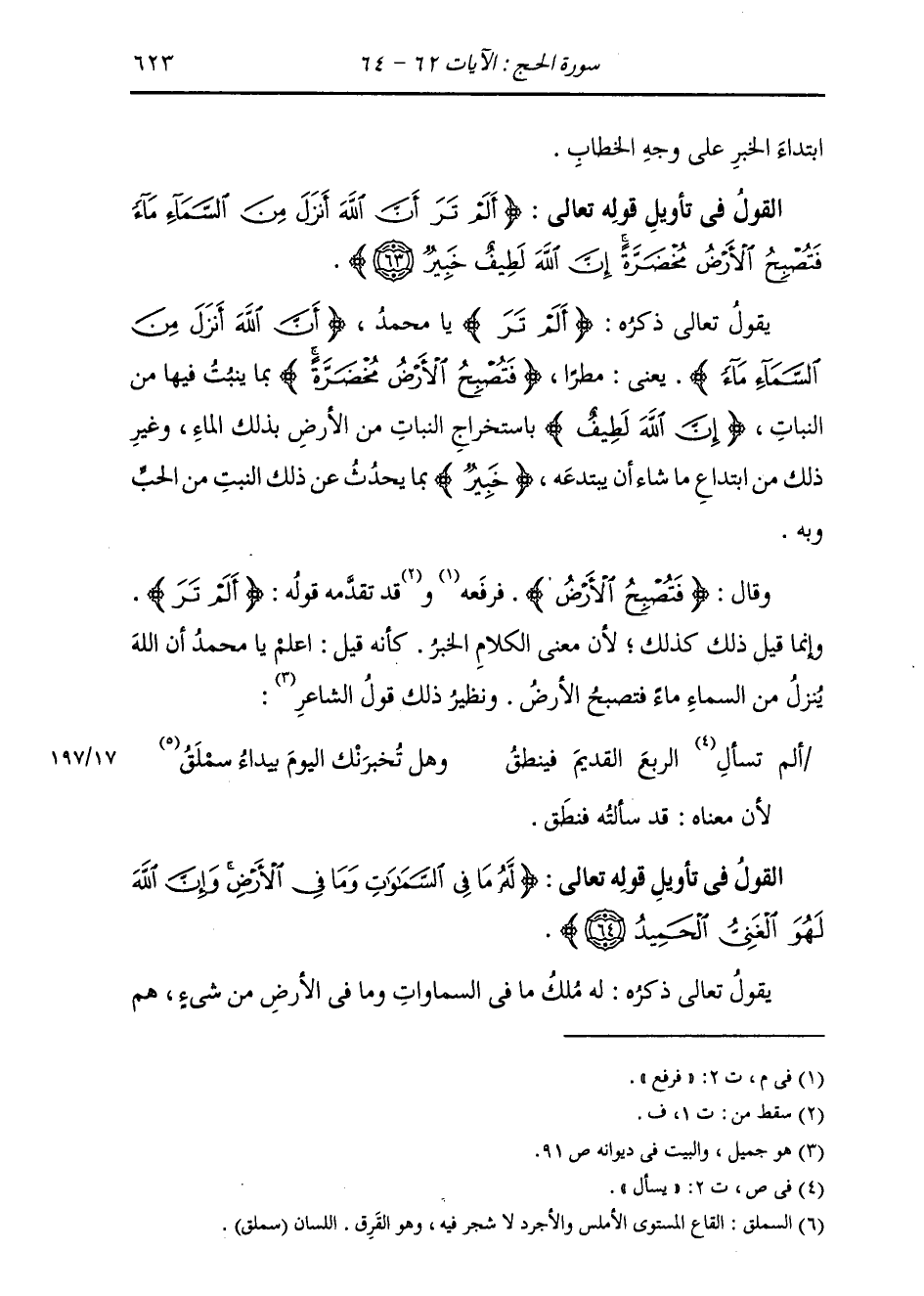 §الْقَوْلُ فِي تَأْوِيلِ قَوْلِهِ تَعَالَى: {أَلَمْ تَرَ أَنَّ اللَّهَ أَنْزَلَ مِنَ السَّمَاءِ مَاءً فَتُصْبِحُ الْأَرْضُ مُخْضَرَّةً إِنَّ اللَّهَ لَطِيفٌ خَبِيرٌ} [الحج: 63] يَقُولُ تَعَالَى ذِكْرُهُ: {أَلَمْ تَرَ} [البقرة: 243] يَا مُحَمَّدُ {أَنَّ اللَّهَ أَنْزَلَ مِنَ السَّمَاءِ مَاءً} [الحج: 63] يَعْنِي مَطَرًا، {فَتُصْبِحُ الْأَرْضُ مُخْضَرَّةً} [الحج: 63] بِمَا يَنْبُتُ فِيهَا مِنَ النَّبَاتِ. قَالَ: {فَتُصْبِحُ الْأَرْضُ} [الحج: 63] فَرَفَعَ، وَقَدْ تَقَدَّمَهُ قَوْلُهُ: {أَلَمْ تَرَ} [البقرة: 243] وَإِنَّمَا قِيلَ ذَلِكَ كَذَلِكَ لِأَنَّ مَعْنَى الْكَلَامِ الْخَبَرُ، كَأَنَّهُ قِيلَ: اعْلَمْ يَا مُحَمَّدُ أَنَّ اللَّهَ يُنَزِّلُ مِنَ السَّمَاءِ مَاءً فَتُصْبِحُ الْأَرْضُ؛ وَنَظِيرُ ذَلِكَ قَوْلُ الشَّاعِرِ: