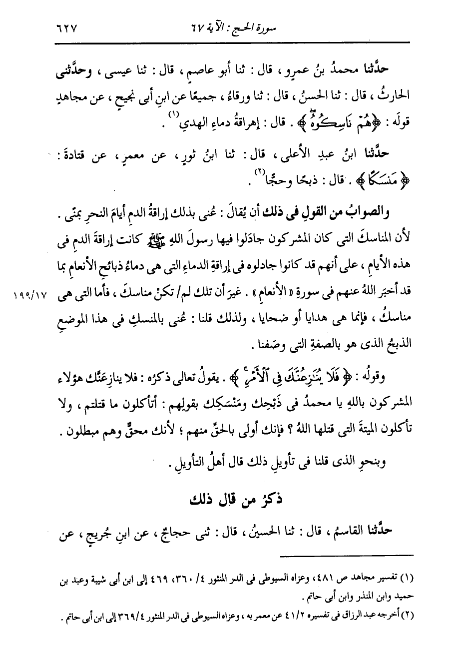 حَدَّثَنَا مُحَمَّدُ بْنُ عَمْرٍو قَالَ: ثنا أَبُو عَاصِمٍ قَالَ: ثنا عِيسَى وَحَدَّثَنِي الْحَارِثُ قَالَ: ثنا الْحَسَنُ قَالَ: ثنا وَرْقَاءُ جَمِيعًا، عَنِ ابْنِ أَبِي نَجِيحٍ، عَنْ مُجَاهِدٍ، قَوْلُهُ: {هُمْ نَاسِكُوهُ} [الحج: 67] قَالَ: «§إِهْرَاقُ دِمَاءِ الْهَدْيِ»