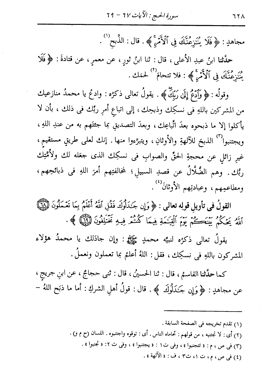 §وَقَوْلُهُ: {وَادْعُ إِلَى رَبِّكَ} [الحج: 67] يَقُولُ تَعَالَى ذِكْرُهُ: وَادْعُ يَا مُحَمَّدُ مُنَازِعِيكَ مِنَ الْمُشْرِكِينَ بِاللَّهِ فِي نُسُكِكَ وَذَبْحِكَ إِلَى اتِّبَاعِ أَمْرِ رَبِّكَ فِي ذَلِكَ بِأَنْ لَا يَأْكُلُوا إِلَّا مَا ذَبَحُوهُ بَعْدَ اتِّبَاعِكَ , وَبَعْدَ التَّصْدِيقِ بِمَا جِئْتَهُمْ بِهِ مِنْ عِنْدِ اللَّهِ، وَتَجَنَّبُوا الذَّبْحَ لِلْآلِهَةِ وَالْأَوْثَانِ , وَتَبَرَّوْا مِنْهَا، إِنَّكَ لَعَلَى طَرِيقٍ مُسْتَقِيمٍ غَيْرِ زَائِلٍ عَنْ مَحَجَّةِ الْحَقِّ , وَالصَّوَابِ فِي نُسُكِكَ الَّذِي جَعَلَهُ لَكَ وَلِأُمَّتِكَ رَبُّكَ، وَهُمُ الضُّلَّالُ عَلَى قَصْدِ السَّبِيلِ، لِمُخَالَفَتِهِمْ أَمْرَ اللَّهِ فِي ذَبَائِحِهِمْ وَمَطَاعِمِهِمْ وَعِبَادَتِهِمُ الْآلِهَةَ