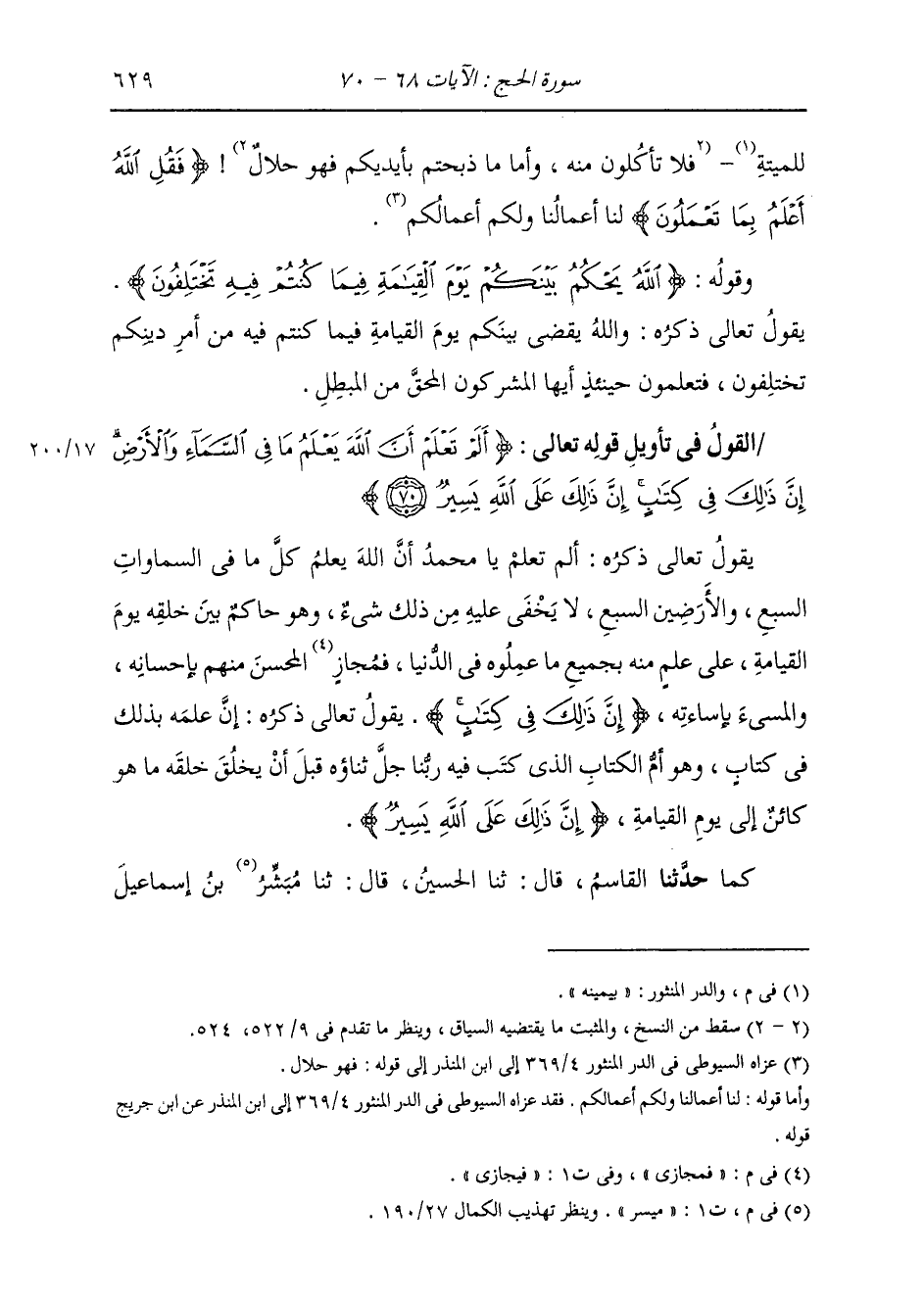 §الْقَوْلُ فِي تَأْوِيلِ قَوْلِهِ تَعَالَى: {أَلَمْ تَعْلَمْ أَنَّ اللَّهَ يَعْلَمُ مَا فِي السَّمَاءِ وَالْأَرْضِ إِنَّ ذَلِكَ فِي كِتَابٍ إِنَّ ذَلِكَ عَلَى اللَّهِ يَسِيرٌ} [الحج: 70] يَقُولُ تَعَالَى ذِكْرُهُ: أَلَمْ تَعْلَمْ يَا مُحَمَّدُ أَنَّ اللَّهَ يَعْلَمُ كُلَّ مَا فِي السَّمَاوَاتِ السَّبْعِ وَالْأَرَضِينَ السَّبْعِ، لَا يَخْفَى عَلَيْهِ مِنْ ذَلِكَ شَيْءٌ، وَهُوَ حَاكِمٌ بَيْنَ خَلْقِهِ يَوْمَ الْقِيَامَةِ، عَلَى عِلْمٍ مِنْهُ بِجَمِيعِ مَا عَمِلُوهُ فِي الدُّنْيَا، فَمُجَازِي الْمُحْسِنَ مِنْهُمْ بِإِحْسَانِهِ , وَالْمُسِيءَ بِإِسَاءَتِهِ. {إِنَّ ذَلِكَ فِي كِتَابٍ} [الحج: 70] يَقُولُ تَعَالَى ذِكْرُهُ: إِنَّ عَلِمَهُ بِذَلِكَ فِي كِتَابٍ، وَهُوَ أُمُّ الْكِتَابِ الَّذِي كَتَبَ فِيهِ رَبُّنَا جَلَّ ثَنَاؤُهُ قَبْلَ أَنْ يَخْلُقَ خَلْقَهُ مَا هُوَ كَائِنٌ إِلَى يَوْمِ الْقِيَامَةِ