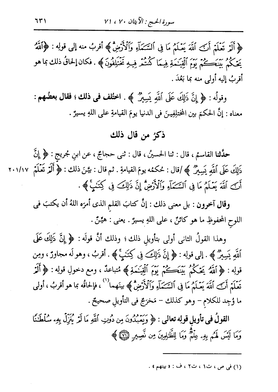 ذِكْرُ مَنْ قَالَ ذَلِكَ حَدَّثَنَا الْقَاسِمُ، قَالَ: ثنا الْحُسَيْنُ، قَالَ: ثني حَجَّاجٌ، عَنِ ابْنِ جُرَيْجٍ: {إِنَّ ذَلِكَ عَلَى اللَّهِ يَسِيرٌ} [الحج: 70] قَالَ: " §حُكْمُهُ يَوْمَ الْقِيَامَةِ، ثُمَّ قَالَ بَيْنَ ذَلِكَ: {أَلَمْ تَعْلَمْ أَنَّ اللَّهَ يَعْلَمُ مَا فِي السَّمَاءِ وَالْأَرْضِ إِنَّ ذَلِكَ فِي كِتَابٍ} [الحج: 70] " وَقَالَ آخَرُونَ: بَلْ مَعْنَى ذَلِكَ: إِنَّ كِتَابَ الْقَلَمِ الَّذِي أَمَرَهُ اللَّهُ أَنْ يَكْتُبَ فِي اللَّوْحِ الْمَحْفُوظِ مَا هُوَ كَائِنٌ عَلَى اللَّهِ يَسِيرٌ , يَعْنِي: هَيِّنٌ. وَهَذَا الْقَوْلُ الثَّانِي أَوْلَى بِتَأْوِيلِ ذَلِكَ، وَذَلِكَ أَنَّ قَوْلُهُ: {إِنَّ ذَلِكَ عَلَى اللَّهِ يَسِيرٌ} [الحج: 70] . إِلَى قَوْلِهِ: {إِنَّ ذَلِكَ فِي كِتَابٍ} [الحج: 70] أَقْرَبُ وَهُوَ لَهُ مُجَاوِرٌ مِنْ قَوْلِهِ: {اللَّهُ يَحْكُمُ بَيْنَكُمْ يَوْمَ الْقِيَامَةِ} [الحج: 69] مُتَبَاعِدٌ مَعَ دُخُولِ قَوْلُهُ: {أَلَمْ تَعْلَمْ أَنَّ اللَّهَ يَعْلَمُ مَا فِي السَّمَاءِ وَالْأَرْضِ} [الحج: 70] بَيْنَهُمَا؛ فَإِلْحَاقُهُ بِمَا هُوَ أَقْرَبُ أَوْلَى مَا وُجِدَ لِلْكَلَامِ، وَهُوَ كَذَلِكَ مُخَرَّجٌ فِي التَّأْوِيلِ صَحِيحٌ