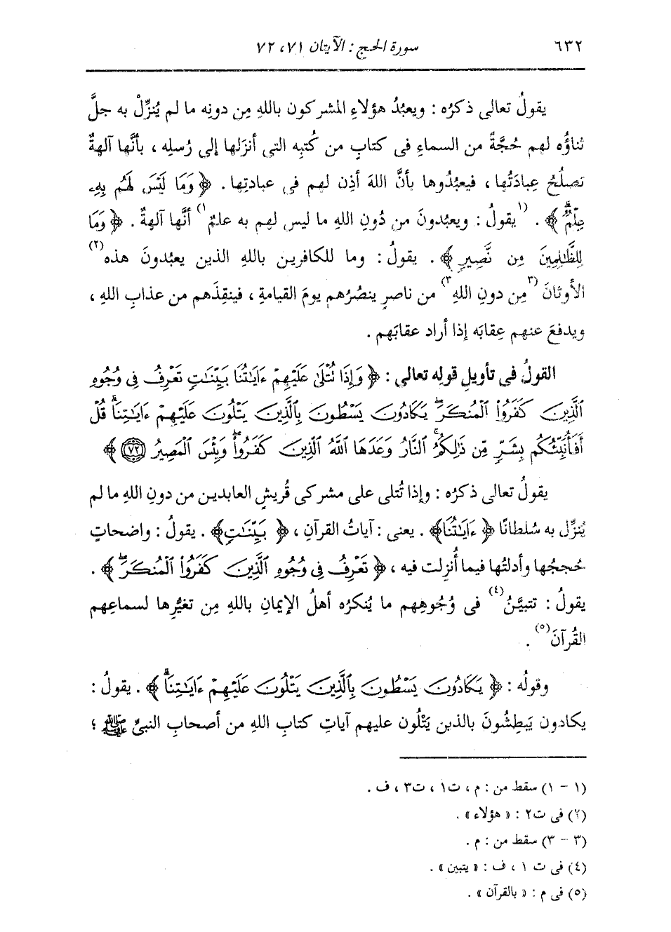 §الْقَوْلُ فِي تَأْوِيلِ قَوْلِهِ تَعَالَى: {وَإِذَا تُتْلَى عَلَيْهِمْ آيَاتُنَا بَيِّنَاتٍ تَعْرِفُ فِي وُجُوهِ الَّذِينَ كَفَرُوا الْمُنكَرَ يَكَادُونَ يَسْطُونَ بِالَّذِينَ يَتْلُونَ عَلَيْهِمْ آيَاتِنَا قُلْ أَفَأُنَبِّئُكُمْ بِشَرٍّ مِنْ ذَلِكُمُ النَّارُ وَعَدَهَا اللَّهُ الَّذِينَ كَفَرُوا وَبِئْسَ الْمَصِيرُ} [الحج: 72] يَقُولُ تَعَالَى ذِكْرُهُ: وَإِذَا تُتْلَى عَلَى مُشْرِكِي قُرَيْشٍ الْعَابِدِينَ مِنْ دُونِ اللَّهِ مَا لَمْ يُنَزِّلْ بِهِ سُلْطَانًا {آيَاتُنَا} [البقرة: 151] يَعْنِي: آيَاتِ الْقُرْآنِ، {بَيِّنَاتٍ} [البقرة: 99] يَقُولُ: وَاضِحَاتٍ حُجَجُهَا وَأَدِلَّتُهَا فِيمَا أُنْزِلَتْ فِيهِ. {تَعْرِفُ فِي وُجُوهِ الَّذِينَ كَفَرُوا الْمُنكَرَ} [الحج: 72] يَقُولُ: تَتَبَيَّنُ فِي وُجُوهِهِمْ مَا يُنْكِرْهُ أَهْلُ الْإِيمَانِ بِاللَّهِ مِنْ تَغَيُّرِهَا، لِسَمَاعِهِمْ بِالْقُرْآنِ