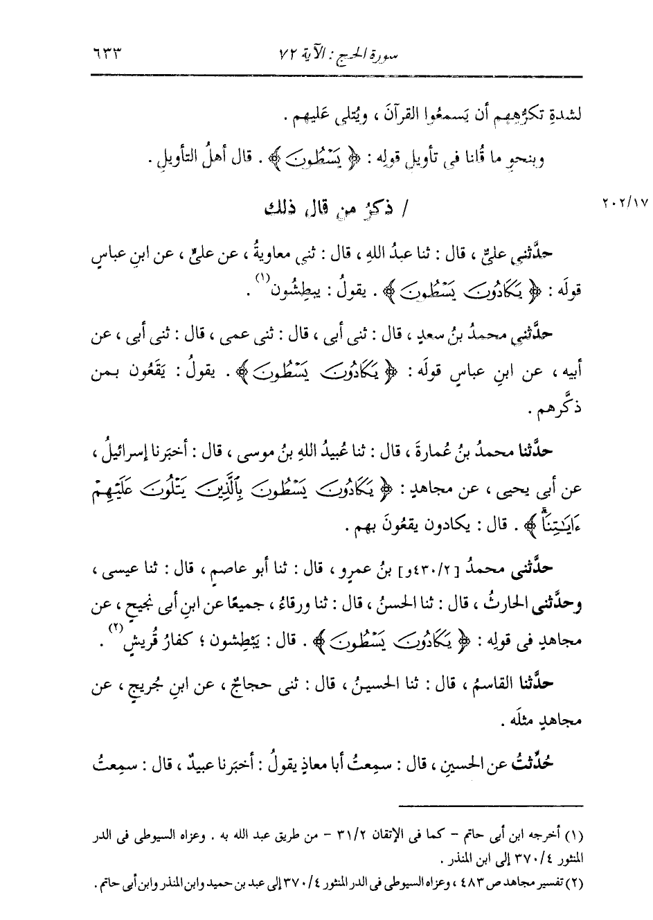 حَدَّثَنِي مُحَمَّدُ بْنُ عَمْرٍو، قَالَ: ثنا أَبُو عَاصِمٍ، قَالَ: ثنا عِيسَى، وَحَدَّثَنِي الْحَارِثُ، قَالَ: ثنا الْحَسَنُ، قَالَ: ثنا وَرْقَاءُ، جَمِيعًا، عَنِ ابْنِ أَبِي نَجِيحٍ، عَنْ مُجَاهِدٍ، قَوْلُهُ: {يَكَادُونَ يَسْطُونَ} [الحج: 72] قَالَ: «§يَبْطِشُونَ كُفَّارُ قُرَيْشٍ» حَدَّثَنَا الْقَاسِمُ قَالَ: ثنا الْحُسَيْنُ قَالَ: ثني حَجَّاجٌ، عَنِ ابْنِ جُرَيْجٍ، عَنْ مُجَاهِدٍ، مِثْلَهُ