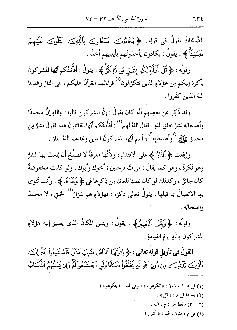 §وَقَوْلُهُ: {قُلْ أَفَأُنَبِّئُكُمْ بِشَرٍّ مِنْ ذَلِكُمْ} [الحج: 72] يَقُولُ: أَفَأُنَبِّئُكُمْ أَيُّهَا الْمُشْرِكُونَ بِأَكْرَهَ إِلَيْكُمْ مِنْ هَؤُلَاءِ الَّذِينَ تَتَكَرَّهُونَ قِرَاءَتَهُمُ الْقُرْآنَ عَلَيْكُمْ، هِيَ {النَّارُ} [البقرة: 24] وَعَدَهَا اللَّهُ الَّذِينَ كَفَرُوا. وَقَدْ ذُكِرَ عَنْ بَعْضِهِمْ أَنَّهُ كَانَ يَقُولُ: إِنَّ الْمُشْرِكِينَ قَالُوا: وَاللَّهِ إِنَّ مُحَمَّدًا وَأَصْحَابَهُ لَشَرُّ خَلْقِ اللَّهِ فَقَالَ اللَّهُ لَهُمْ: قُلْ أَفَأُنَبِّئُكُمْ أَيُّهَا الْقَائِلُونَ هَذَا الْقَوْلَ بِشَرٍّ مِنْ مُحَمَّدٍ صَلَّى اللهُ عَلَيْهِ وَسَلَّمَ؟ أَنْتُمْ أَيُّهَا الْمُشْرِكُونَ الَّذِينَ وَعَدَهُمُ اللَّهُ النَّارَ. وَرُفِعَتِ (النَّارُ) عَلَى الِابْتِدَاءِ، وَلِأَنَّهَا مَعْرِفَةٌ , لَا تَصْلُحُ أَنْ يُنْعَتَ بِهَا الشَّرُّ وَهُوَ نَكِرَةٌ، كَمَا يُقَالُ: مَرَرْتُ بِرَجُلَيْنِ: أَخُوكَ وَأَبُوكَ، وَلَوْ كَانَتْ مَخْفُوضَةً كَانَ جَائِزًا؛ وَكَذَلِكَ لَوْ كَانَ نَصْبًا لِلْعَائِدِ مِنْ ذِكْرِهَا فِي {وَعَدَهَا} [التوبة: 114] وَأَنْتَ تَنْوِي بِهَا الِاتِّصَالَ بِمَا قَبْلَهَا. يَقُولُ تَعَالَى ذِكْرُهُ: فَهَؤُلَاءِ هُمْ أَشْرَارُ الْخَلْقِ لَا مُحَمَّدٌ وَأَصْحَابُهُ