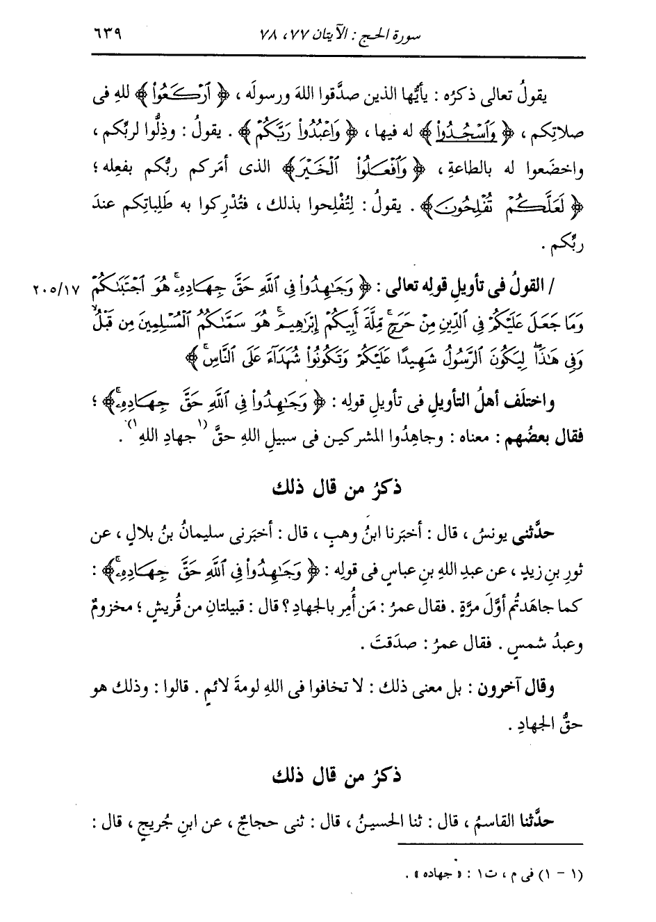 ذِكْرُ مَنْ قَالَ ذَلِكَ: حَدَّثَنَا الْقَاسِمُ، قَالَ: ثنا الْحُسَيْنُ، قَالَ: ثني حَجَّاجٌ، عَنِ ابْنِ جُرَيْجٍ، قَالَ: -[640]- قَالَ ابْنُ عَبَّاسٍ فِي قَوْلِهِ: " {§وَجَاهِدُوا فِي اللَّهِ حَقَّ جِهَادِهِ} [الحج: 78] لَا تَخَافُوا فِي اللَّهِ لَوْمَةَ لَائِمٍ " وَقَالَ آخَرُونَ: مَعْنَى ذَلِكَ: اعْمَلُوا بِالْحَقِّ حَقَّ عَمَلِهِ. وَهَذَا قَوْلٌ ذَكَرَهُ عَنِ الضَّحَّاكِ بَعْضُ مَنْ فِي رِوَايَتِهِ نَظَرٌ. وَالصَّوَابُ مِنَ الْقَوْلِ فِي ذَلِكَ: قَوْلُ مَنْ قَالَ: عَنَى بِهِ الْجِهَادَ فِي سَبِيلِ اللَّهِ؛ لِأَنَّ الْمَعْرُوفَ مِنَ الْجِهَادِ ذَلِكَ، وَهُوَ الْأَغْلَبُ عَلَى قَوْلِ الْقَائِلِ: جَاهَدْتُ فِي اللَّهِ. وَحَقُّ الْجِهَادِ: هُوَ اسْتِفْرَاغُ الطَّاقِةِ فِيهِ