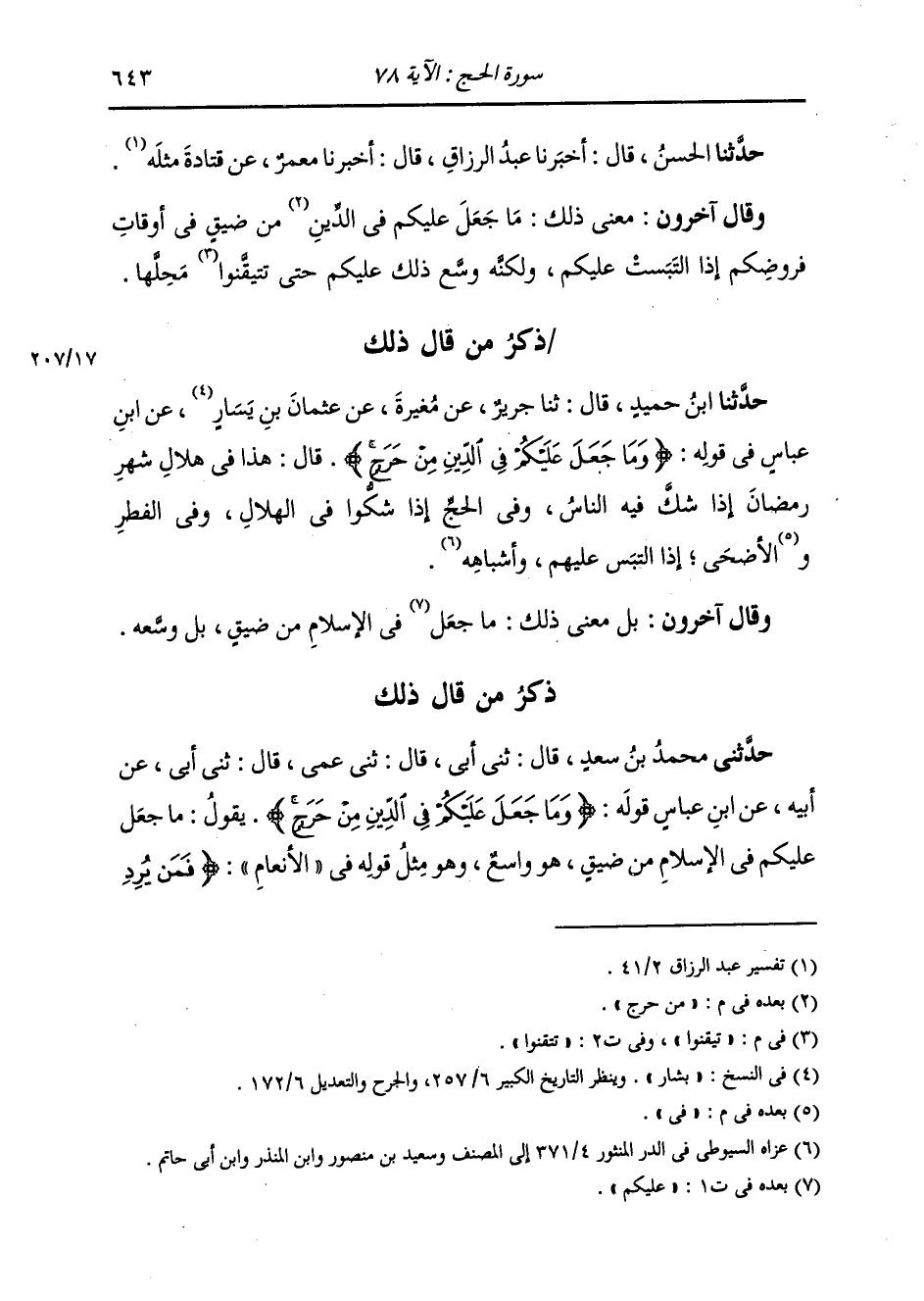 ذِكْرُ مَنْ قَالَ ذَلِكَ حَدَّثَنَا ابْنُ حُمَيْدٍ، قَالَ: ثنا جَرِيرٌ، عَنْ مُغِيرَةَ، عَنْ عُثْمَانَ بْنِ بَشَّارٍ، عَنِ ابْنِ عَبَّاسٍ، فِي قَوْلِهِ: {وَمَا جَعَلَ عَلَيْكُمْ فِي الدِّينِ مِنْ حَرَجٍ} [الحج: 78] قَالَ: " §هَذَا فِي هِلَالِ شَهْرِ رَمَضَانَ إِذَا شَكَّ فِيهِ النَّاسُ، وَفِي الْحَجِّ إِذَا شَكُّوا فِي الْهِلَالِ، وَفِي الْفِطْرِ وَالْأَضْحَى إِذَا الْتَبَسَ عَلَيْهِمْ، وَأَشْبَاهِهِ وَقَالَ آخَرُونَ: بَلْ مَعْنَى ذَلِكَ: مَا جَعَلَ فِي الْإِسْلَامِ مِنْ ضِيقٍ، بَلْ وَسَّعَهُ