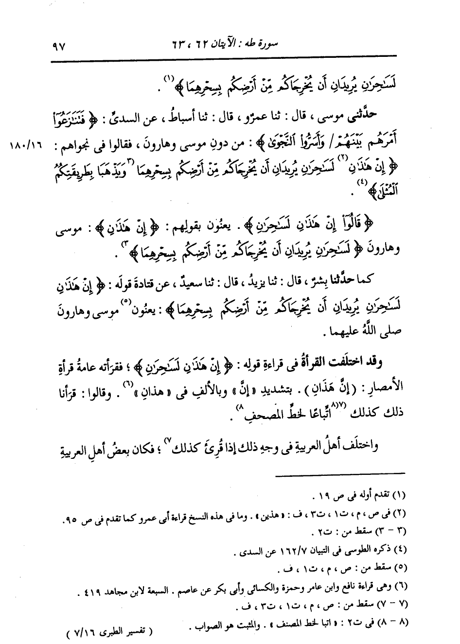 كَمَا حَدَّثَنَا بِشْرٌ، قَالَ: ثنا يَزِيدُ، قَالَ: ثنا سَعِيدٌ، عَنْ قَتَادَةَ، قَوْلُهُ: {§إِنْ هَذَانِ لَسَاحِرَانِ يُرِيدَانِ أَنْ يُخْرِجَاكُمْ مِنْ أَرْضِكُمْ بِسِحْرِهِمَا} [طه: 63] مُوسَى وَهَارُونُ صَلَّى اللَّهُ عَلَيْهِمَا وَقَدِ اخْتَلَفَتِ الْقُرَّاءُ فِي قِرَاءَةِ قَوْلِهِ: {إِنْ هَذَانِ لَسَاحِرَانِ} [طه: 63] فَقَرَأَتْهُ عَامَّةُ قُرَّاءِ الْأَمْصَارِ: (إِنَّ هَذَانِ) بِتَشْدِيدِ إِنَّ وَبِالْأَلِفِ فِي هَذَانِ، وَقَالُوا: قَرَأْنَا ذَلِكَ كَذَلِكَ. وَكَانَ بَعْضُ أَهْلِ الْعَرَبِيَّةِ
