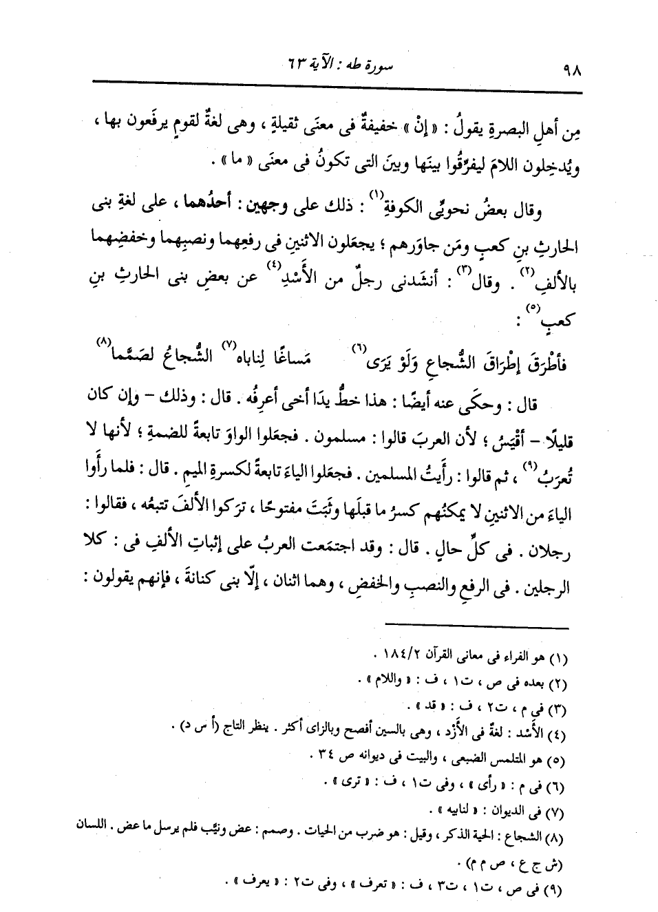 مِنْ أَهْلِ الْبَصْرَةِ يَقُولُ: «إِنْ» خَفِيفَةٌ فِي مَعْنَى ثَقِيلَةٍ، وَهِيَ لُغَةُ لِقَوْمٍ يَرْفَعُونَ بِهَا، وَيُدْخِلُونَ اللَّامَ لِيُفَرِّقُوا بَيْنَهَا وَبَيْنَ الَّتِي تَكُونُ فِي مَعْنَى مَا. وَقَالَ بَعْضُ نَحْوِيِّي الْكُوفَةِ: ذَلِكَ عَلَى وَجْهَيْنِ: أَحَدُهُمَا عَلَى لُغَةِ بَنِي الْحَارِثِ بْنِ كَعْبٍ وَمَنْ جَاوَرَهُمْ، يَجْعَلُونَ الِاثْنَيْنِ فِي رَفْعِهِمَا وَنَصْبِهِمَا وَخَفْضِهِمَا بِالْأَلِفِ. وَقَدْ أَنْشَدَنِي رَجُلٌ مِنَ الْأَسَدِ عَنْ بَعْضِ بَنِي الْحَارِثِ بْنِ كَعْبٍ:
