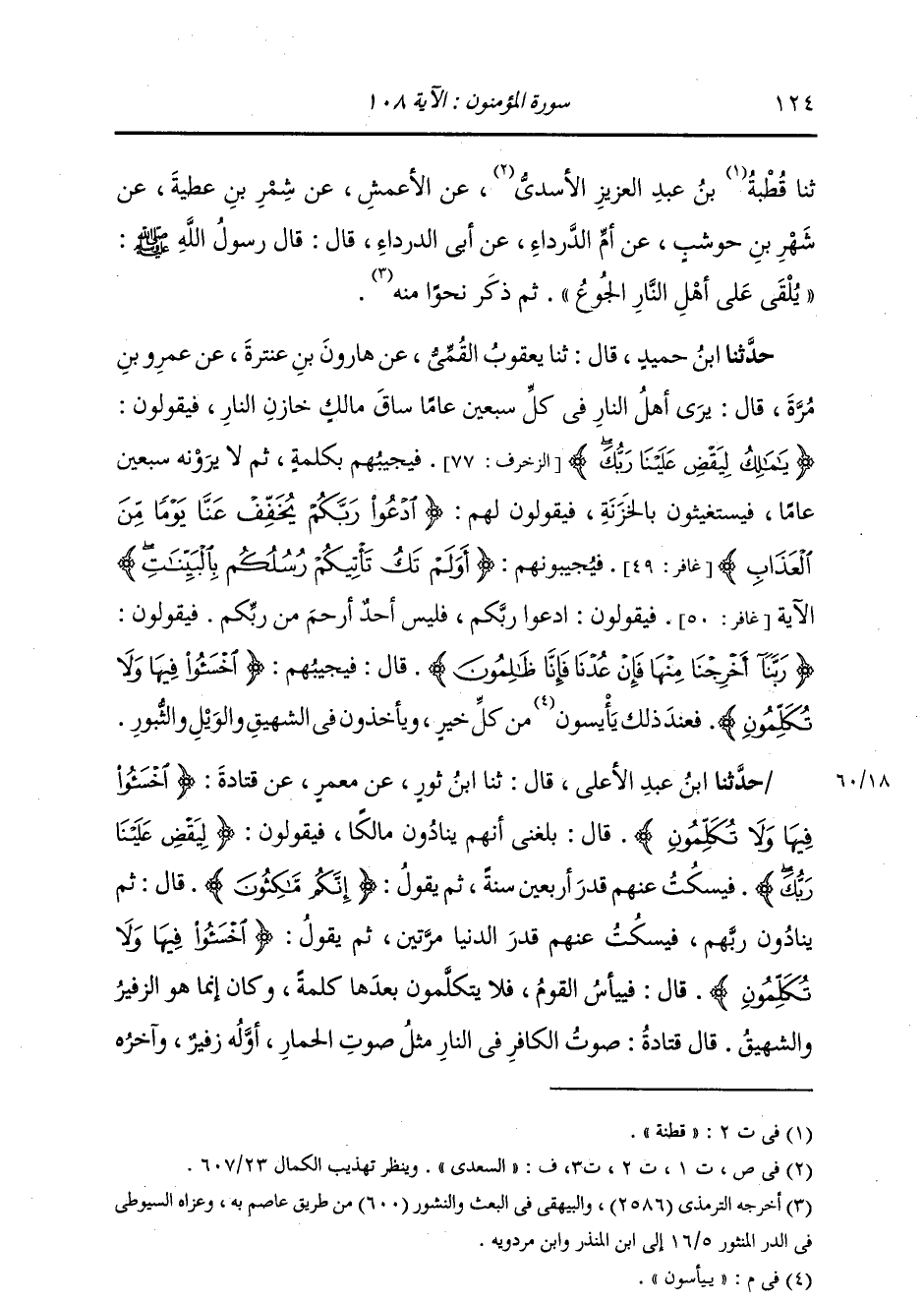 حَدَّثَنَا ابْنُ عَبْدِ الْأَعْلَى، قَالَ: ثنا ابْنُ ثَوْرٍ، عَنْ مَعْمَرٍ، عَنْ قَتَادَةَ: {§اخْسَئُوا فِيهَا وَلَا تُكَلِّمُونِ} قَالَ: " بَلَغَنِي أَنَّهُمْ يُنَادُونَ مَالِكًا فَيَقُولُونَ: لِيَقْضِ عَلَيْنَا رَبُّكَ فَيَسْكُتُ عَنْهُمْ قَدْرَ أَرْبَعِينَ سَنَةً، ثُمَّ يَقُولُ: {إِنَّكُمْ مَاكِثُونَ} [الزخرف: 77] ". قَالَ: " ثُمَّ يُنَادُونَ رَبَّهُمْ، فَيَسْكُتُ عَنْهُمْ قَدْرَ الدُّنْيَا مَرَّتَيْنِ، ثُمَّ يَقُولُ: {اخْسَئُوا فِيهَا وَلَا تُكَلِّمُونِ} ". قَالَ: «فَيَيْأَسُ الْقَوْمُ، فَلَا يَتَكَلَّمُونَ بَعْدَهَا كَلِمَةً، وَكَانَ إِنَّمَا هُوَ الزَّفِيرُ وَالشَّهِيقُ» قَالَ قَتَادَةُ: " صَوْتُ الْكَافِرِ فِي النَّارِ مِثْلُ صَوْتِ الْحِمَارِ: أَوَّلُهُ زَفِيرٌ، وَآخِرَهُ -[125]- شَهِيقٌ " حَدَّثَنَا الْحَسَنُ قَالَ: أَخْبَرَنَا عَبْدُ الرَّزَّاقِ قَالَ: أَخْبَرَنَا مَعْمَرٌ، عَنْ قَتَادَةَ، مِثْلَهُ