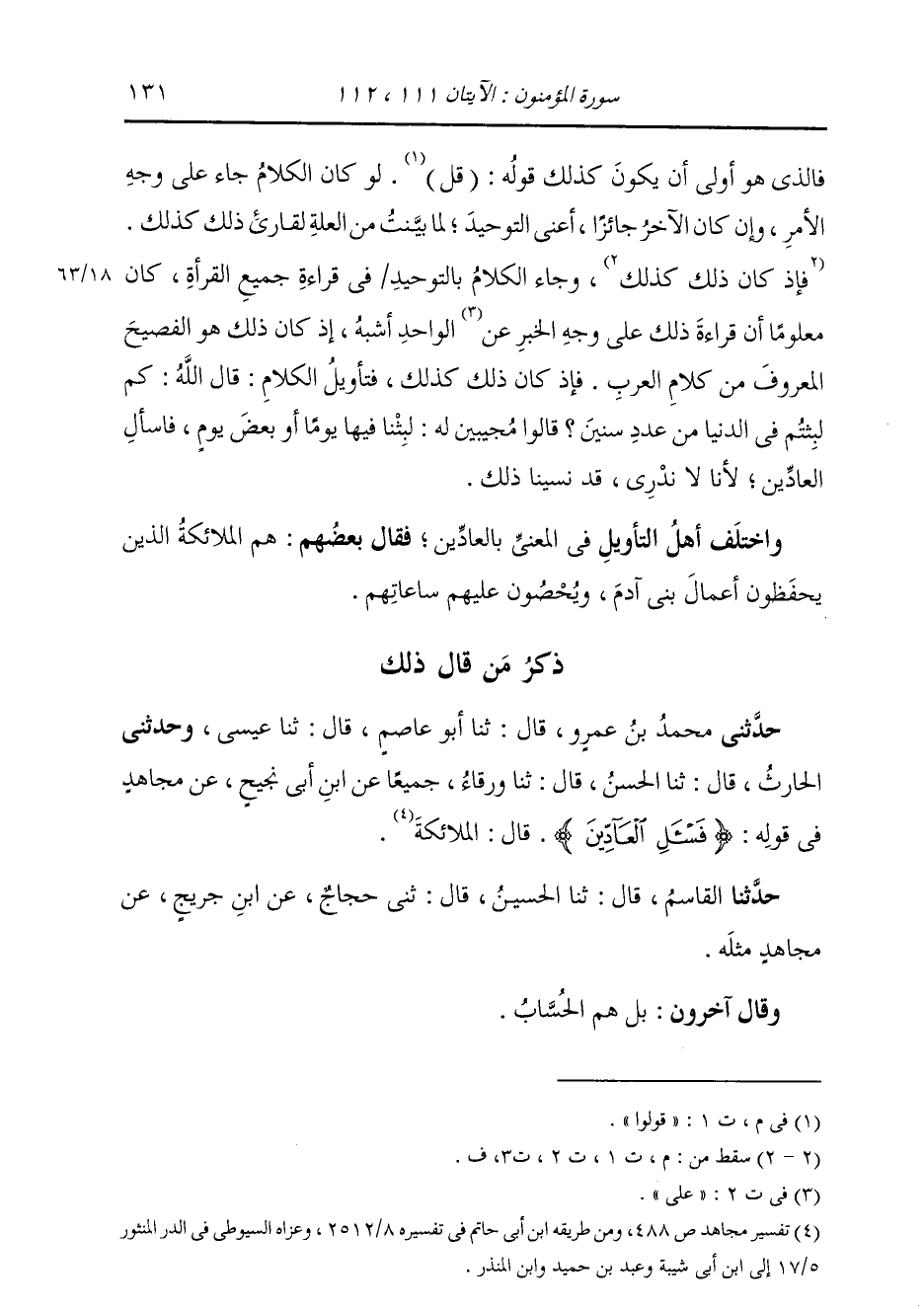 ذِكْرُ مَنْ قَالَ ذَلِكَ: حَدَّثَنِي مُحَمَّدُ بْنُ عَمْرٍو، قَالَ: ثنا أَبُو عَاصِمٍ، قَالَ: ثنا عِيسَى، وَحَدَّثَنِي الْحَارِثُ، قَالَ: ثنا الْحَسَنُ، قَالَ: ثنا وَرْقَاءُ، جَمِيعًا، عَنِ ابْنِ أَبِي نَجِيحٍ، عَنْ مُجَاهِدٍ، قَوْلُهُ: {§فَاسْأَلِ الْعَادِّينَ} [المؤمنون: 113] قَالَ: «الْمَلَائِكَةُ» حَدَّثَنَا الْقَاسِمُ قَالَ: ثنا الْحُسَيْنُ قَالَ: ثني حَجَّاجٌ، عَنِ ابْنِ جُرَيْجٍ، عَنْ مُجَاهِدٍ، مِثْلَهُ وَقَالَ آخَرُونَ: بَلْ هُمُ الْحُسَّابُ