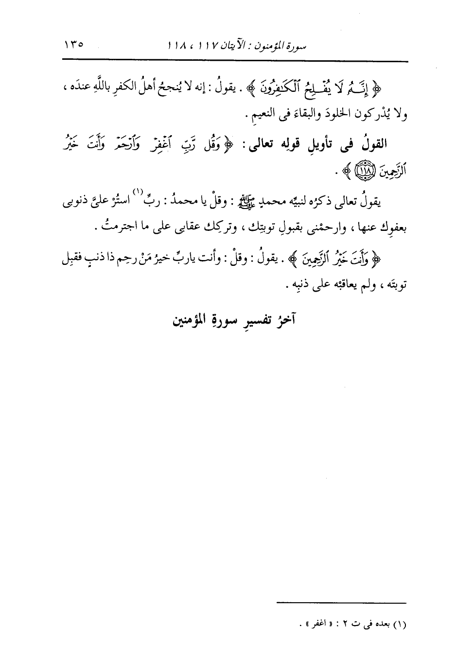 §الْقَوْلُ فِي تَأْوِيلِ قَوْلِهِ تَعَالَى: {وَقُلْ رَبِّ اغْفِرْ وَارْحَمْ وَأَنْتَ خَيْرُ الرَّاحِمِينَ} [المؤمنون: 118] يَقُولُ تَعَالَى ذِكْرُهُ لِنَبِيِّهِ مُحَمَّدٍ صَلَّى اللهُ عَلَيْهِ وَسَلَّمَ: وَقُلْ يَا مُحَمَّدُ: رَبِّ اسْتُرْ عَلَيَّ ذُنُوبِي بِعَفْوِكَ عَنْهَا , وَارْحَمْنِي بِقَبُولِ تَوْبَتِكَ , وَتَرْكِكَ عِقَابِي عَلَى مَا اجْتَرَمْتُ. {وَأَنْتَ خَيْرُ الرَّاحِمِينَ} [المؤمنون: 109] يَقُولُ: وَقُلْ: أَنْتَ يَا رَبِّ خَيْرُ مَنْ رَحِمِ ذَا ذَنْبٍ فَقَبِلَ تَوْبَتَهُ وَلَمْ يُعَاقِبْهُ عَلَى ذَنْبِهِ