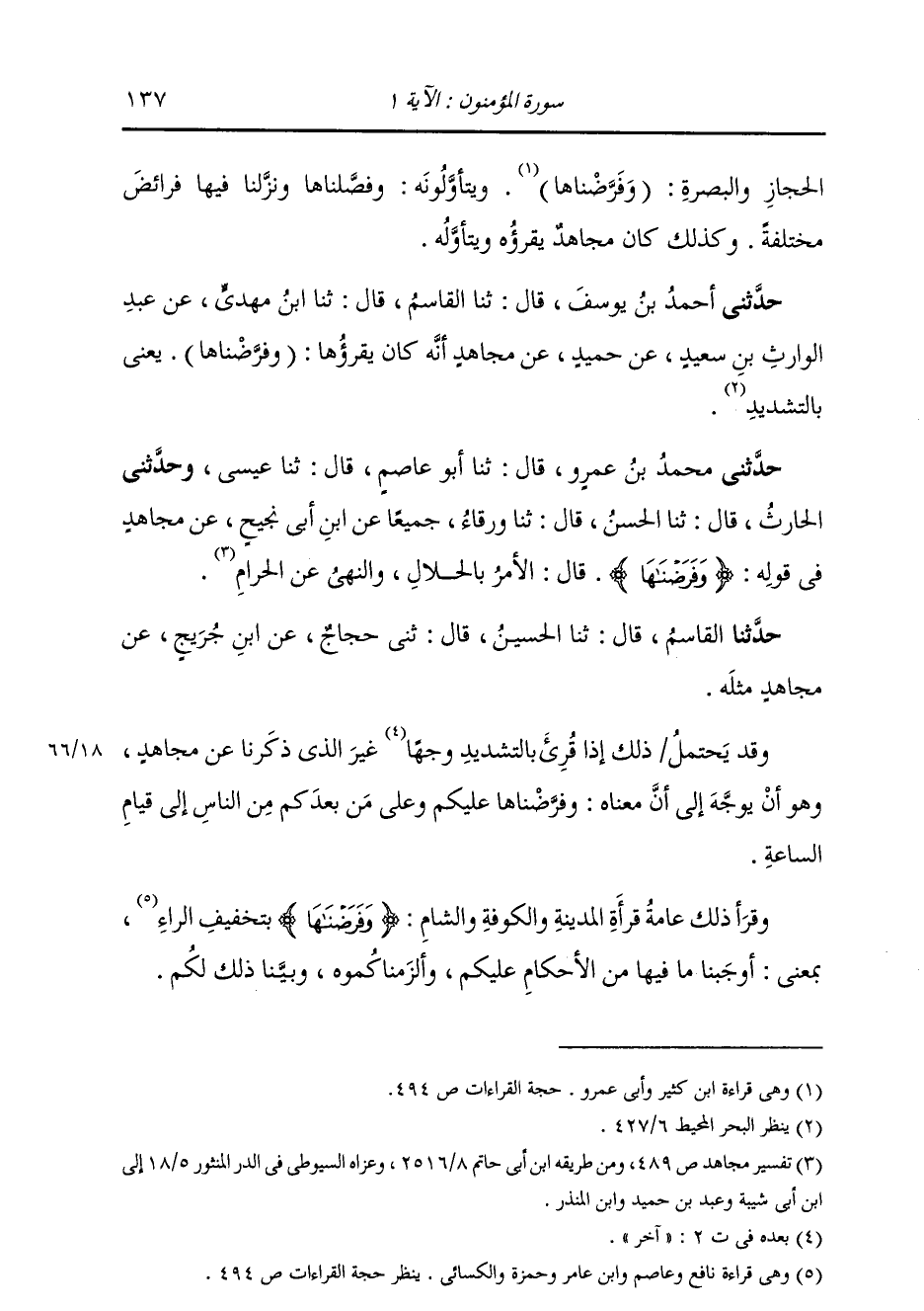 حَدَّثَنِي مُحَمَّدُ بْنُ عَمْرٍو، قَالَ: ثنا أَبُو عَاصِمٍ، قَالَ: ثنا عِيسَى، وَحَدَّثَنِي الْحَارِثُ، قَالَ: ثنا الْحَسَنُ، قَالَ: ثنا وَرْقَاءُ جَمِيعًا، عَنِ ابْنِ أَبِي نَجِيحٍ، عَنْ مُجَاهِدٍ، فِي قَوْلِهِ: {§وَفَرَضْنَاهَا} [النور: 1] قَالَ: «الْأَمْرُ بِالْحَلَالِ، وَالنَّهْي عَنِ الْحَرَامِ» حَدَّثَنَا الْقَاسِمُ قَالَ: ثنا الْحُسَيْنُ قَالَ: ثني حَجَّاجٌ، عَنِ ابْنِ جُرَيْجٍ، عَنْ مُجَاهِدٍ، مِثْلَهُ وَقَدْ يَحْتَمِلُ ذَلِكَ إِذَا قُرِئَ بِالتَّشْدِيدِ وَجْهًا غَيْرَ الَّذِي ذَكَرْنَا عَنْ مُجَاهِدٍ، وَهُوَ أَنْ يُوَجَّهَ إِلَى أَنَّ مَعْنَاهُ: وَفَرَّضْنَاهَا عَلَيْكُمْ وَعَلَى مَنْ بَعْدَكُمْ مِنَ النَّاسِ إِلَى قِيَامِ السَّاعَةِ. وَقَرَأَ ذَلِكَ عَامَّةُ قُرَّاءِ الْمَدِينَةِ وَالْكُوفَةِ وَالشَّامِ: {وَفَرَضْنَاهَا} [النور: 1] بِتَخْفِيفِ الرَّاءِ، بِمَعْنَى: أَوْجَبْنَا مَا فِيهَا مِنَ الْأَحْكَامِ عَلَيْكُمْ , وَأَلْزَمْنَاكُمُوهُ , وَبَيَّنَّا ذَلِكَ لَكُمْ -[138]- وَالصَّوَابُ مِنَ الْقَوْلِ فِي ذَلِكَ: أَنَّهُمَا قِرَاءَتَانِ مَشْهُورَتَانِ قَدْ قَرَأَ بِكُلِّ وَاحِدَةٍ مِنْهُمَا عُلَمَاءٌ مِنَ الْقُرَّاءِ، فَبِأَيَّتِهِمَا قَرَأَ الْقَارِئُ فَمُصِيبٌ. وَذَلِكَ أَنَّ اللَّهَ قَدْ فَصَّلَهَا، وَأَنْزَلَ فِيهَا ضُرُوبًا مِنَ الْأَحْكَامِ، وَأَمَرَ فِيهَا وَنَهَى، وَفَرَضَ عَلَى عِبَادِهِ فِيهَا فَرَائِضَ، فَفِيهَا الْمَعْنَيَانِ كِلَاهُمَا: التَّفْرِيضُ، وَالْفَرْضُ , فَلِذَلِكَ قُلْنَا بِأَيَّةِ الْقِرَاءَتَيْنِ قَرَأَ الْقَارِئُ فَمُصِيبٌ الصَّوَابَ