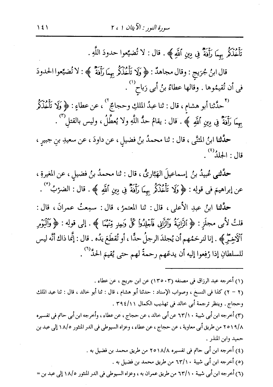 قَالَ ابْنُ جُرَيْجٍ: وَقَالَ مُجَاهِدٌ: {§لَا تَأْخُذْكُمْ بِهِمَا رَأْفَةٌ} [النور: 2] لَا تُضَيِّعُوا الْحُدُودَ فِي أَنْ تُقِيمُوهَا. وَقَالَهَا عَطَاءُ بْنُ أَبِي رَبَاحٍ "