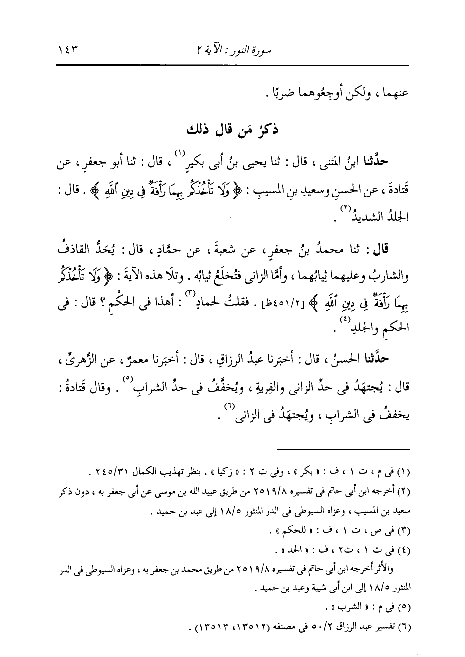 ذِكْرُ مَنْ قَالَ ذَلِكَ حَدَّثَنَا ابْنُ الْمُثَنَّى، قَالَ: ثنا يَحْيَى بْنُ أَبِي بَكْرٍ قَالَ: ثنا أَبُو جَعْفَرٍ، عَنْ قَتَادَةَ، عَنِ الْحَسَنِ، وَسَعِيدِ بْنِ الْمُسَيَّبِ: {§وَلَا تَأْخُذْكُمْ بِهِمَا رَأْفَةٌ فِي دِينِ اللَّهِ} [النور: 2] قَالَ: الْجَلْدُ الشَّدِيدُ "