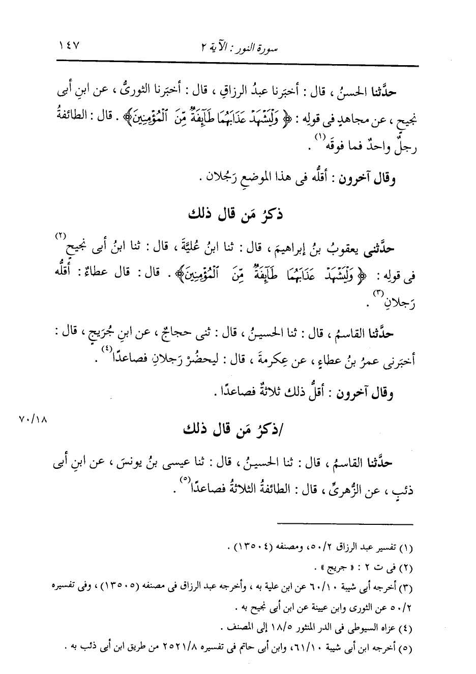 حَدَّثَنَا الْحَسَنُ، قَالَ: أَخْبَرَنَا عَبْدُ الرَّزَّاقِ، قَالَ: أَخْبَرَنَا الثَّوْرِيُّ، عَنِ ابْنِ أَبِي نَجِيحٍ، عَنْ مُجَاهِدٍ، فِي قَوْلِهِ: {§وَلْيَشْهَدْ عَذَابَهُمَا طَائِفَةٌ مِنَ الْمُؤْمِنِينَ} [النور: 2] قَالَ: " الطَّائِفَةُ: رَجُلٌ وَاحِدٌ فَمَا فَوْقَهُ " وَقَالَ آخَرُونَ: أَقَلُّهُ فِي هَذَا الْمَوْضِعِ رَجُلَانِ