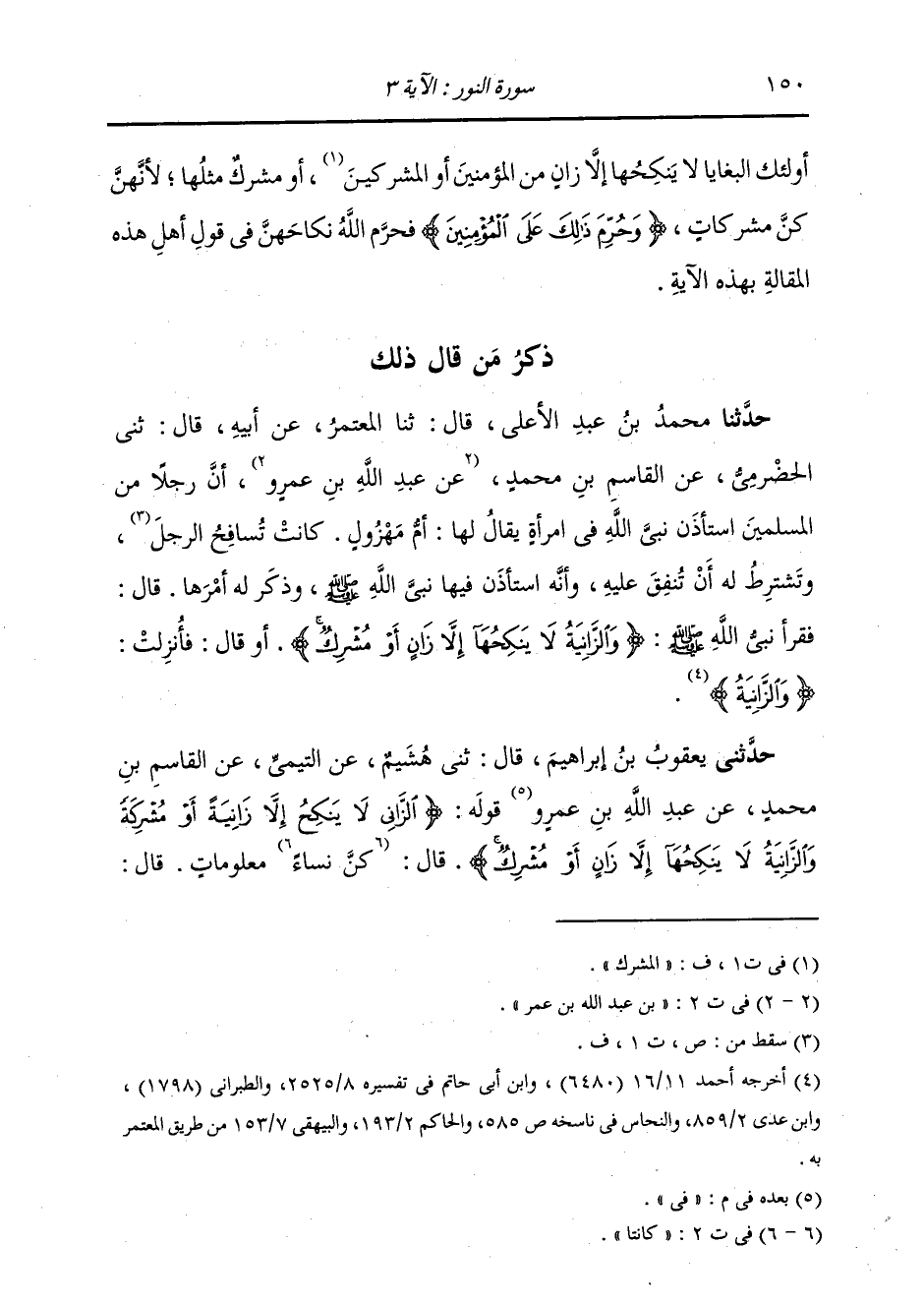 حَدَّثَنِي يَعْقُوبُ بْنُ إِبْرَاهِيمَ، قَالَ: ثني هُشَيْمُ، عَنِ التَّيْمِيِّ، عَنِ الْقَاسِمِ بْنِ مُحَمَّدٍ، عَنْ عَبْدِ اللَّهِ بْنِ عَمْرٍو، فِي قَوْلِهِ: {§الزَّانِي لَا يَنْكِحُ إِلَّا زَانِيَةً أَوْ مُشْرِكَةً وَالزَّانِيَةُ لَا يَنْكِحُهَا إِلَّا زَانٍ أَوْ مُشْرِكٌ} [النور: 3] قَالَ: " كُنَّ نِسَاءً مَعْلُومَاتٍ قَالَ: -[151]- فَكَانَ الرَّجُلُ مِنْ فُقَرَاءِ الْمُسْلِمِينَ يَتَزَوَّجُ الْمَرْأَةَ مِنْهُنَّ لِتُنْفِقَ عَلَيْهِ، فَنَهَاهُمُ اللَّهُ عَنْ ذَلِكَ "
