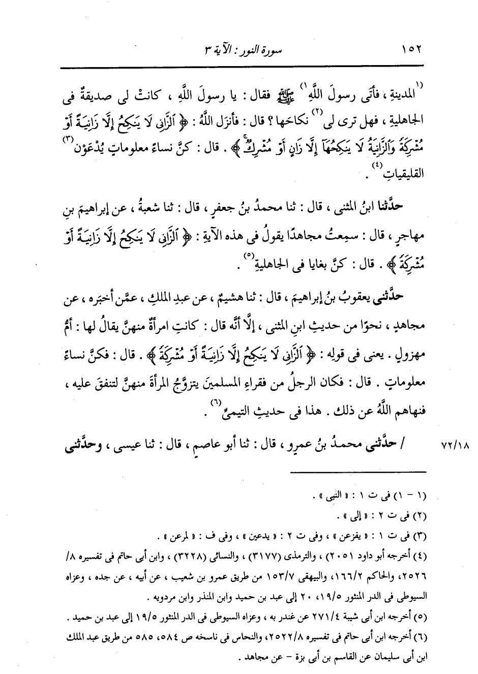 حَدَّثَنِي مُحَمَّدُ بْنُ عَمْرٍو قَالَ: ثنا أَبُو عَاصِمٍ قَالَ: ثنا عِيسَى وَحَدَّثَنِي -[153]- الْحَارِثُ قَالَ: ثنا الْحَسَنُ قَالَ: ثنا وَرْقَاءُ جَمِيعًا، عَنِ ابْنِ أَبِي نَجِيحٍ، عَنْ مُجَاهِدٍ، فِي قَوْلِ اللَّهِ: {§الزَّانِي لَا يَنْكِحُ إِلَّا زَانِيَةً} [النور: 3] قَالَ: " رِجَالٌ كَانُوا يُرِيدُونَ الزِّنَا بِنِسَاءٍ زَوَانٍ بَغَايَا مُتَعَالِمَاتٍ , كُنَّ فِي الْجَاهِلِيَّةِ، فَقِيلَ لَهُمْ: هَذَا حَرَامٌ، فَأَرَادُوا نِكَاحَهُنَّ، فَحَرَّمَ اللَّهُ عَلَيْهِمْ نِكَاحَهُنَّ " حَدَّثَنَا الْقَاسِمُ قَالَ: ثنا الْحُسَيْنُ قَالَ: ثني حَجَّاجٌ، عَنِ ابْنِ جُرَيْجٍ، عَنْ مُجَاهِدٍ، بِنَحْوِهِ، إِلَّا أَنَّهُ قَالَ: بَغَايَا مُعْلِنَاتٍ , كُنَّ كَذَلِكَ فِي الْجَاهِلِيَّةِ