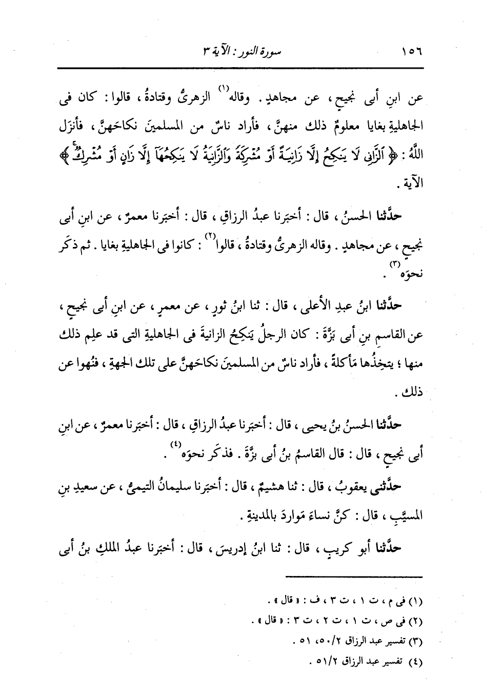 حَدَّثَنَا ابْنُ عَبْدِ الْأَعْلَى، قَالَ: ثنا ابْنُ ثَوْرٍ، عَنْ مَعْمَرٍ، عَنِ ابْنِ أَبِي نَجِيحٍ، عَنِ الْقَاسِمِ بْنِ أَبِي بَزَّةَ: «§كَانَ الرَّجُلُ يَنْكِحُ الزَّانِيَةَ فِي الْجَاهِلِيَّةِ الَّتِي قَدْ عُلِمَ ذَلِكَ مِنْهَا , يَتَّخِذُهَا مَأْكَلَةً، فَأَرَادَ نَاسٌ مِنَ الْمُسْلِمِينَ نِكَاحَهُنَّ عَلَى تِلْكَ الْجِهَةِ، فَنُهُوا عَنْ ذَلِكَ» حَدَّثَنَا الْحَسَنُ بْنُ يَحْيَى قَالَ: أَخْبَرَنَا عَبْدُ الرَّزَّاقِ قَالَ: أَخْبَرَنَا مَعْمَرٌ، عَنِ ابْنِ أَبِي نَجِيحٍ قَالَ: قَالَ الْقَاسِمُ بْنُ أَبِي بَزَّةَ، فَذَكَرَ نَحْوَهُ