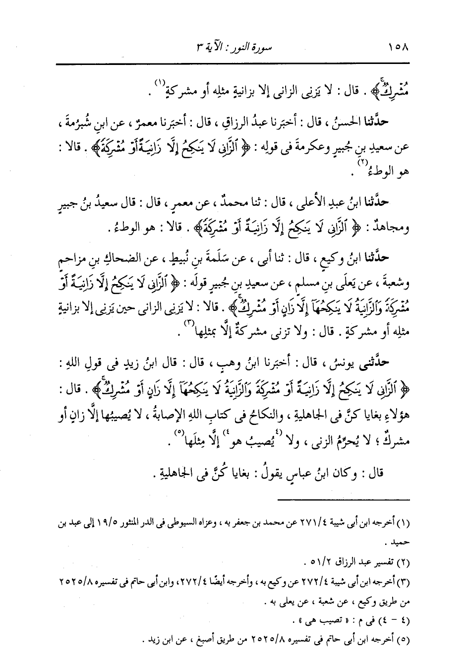 حَدَّثَنَا الْحَسَنُ، قَالَ: أَخْبَرَنَا عَبْدُ الرَّزَّاقِ، قَالَ: أَخْبَرَنَا مَعْمَرٌ، عَنِ ابْنِ شُبْرُمَةَ، عَنْ سَعِيدِ بْنِ جُبَيْرٍ، وَعِكْرِمَةَ، فِي قَوْلِهِ: {§الزَّانِي لَا يَنْكِحُ إِلَّا زَانِيَةً أَوْ مُشْرِكَةً} [النور: 3] قَالَا: «هُوَ الْوَطْءُ»