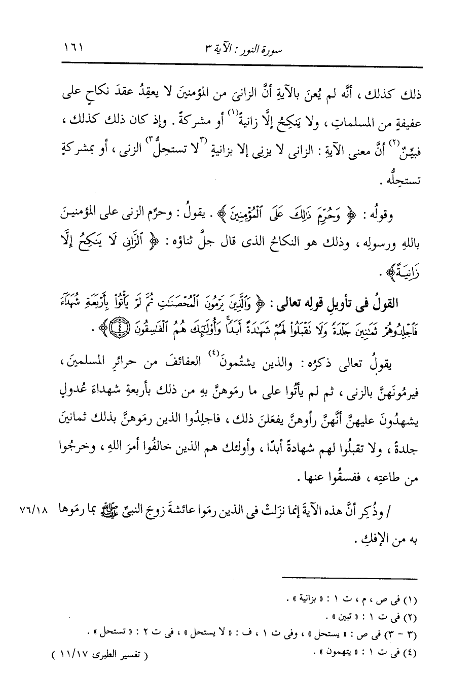 §وَقَوْلُهُ: {وَحُرِّمَ ذَلِكَ عَلَى الْمُؤْمِنِينَ} [النور: 3] يَقُولُ: وَحُرِّمَ الزِّنَا عَلَى الْمُؤْمِنِينَ بِاللَّهِ وَرَسُولِهِ، وَذَلِكَ هُوَ النِّكَاحُ الَّذِي قَالَ جَلَّ ثَنَاؤُهُ: {الزَّانِي لَا يَنْكِحُ إِلَّا زَانِيَةً} [النور: 3]