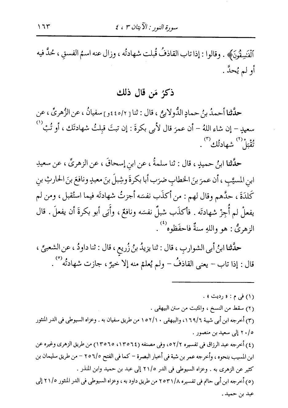 حَدَّثَنَا ابْنُ حُمَيْدٍ، قَالَ: ثنا سَلَمَةُ، عَنِ ابْنِ إِسْحَاقَ، عَنِ الزُّهْرِيِّ، عَنْ سَعِيدِ بْنِ الْمُسَيِّبِ، أَنَّ عُمَرَ بْنَ الْخَطَّابِ، ضَرَبَ أَبَا بَكْرَةَ , وَشِبْلَ بْنَ مَعْبَدٍ , وَنَافِعَ بْنَ الْحَارِثِ بْنِ كَلَدَةَ حَدَّهُمْ. وَقَالَ لَهُمْ: «§مَنْ أَكْذَبَ نَفْسَهُ أَجَزْتُ شَهَادَتَهُ فِيمَا اسْتَقْبَلَ، وَمَنْ لَمْ يَفْعَلْ لَمْ أُجِزْ شَهَادَتَهُ» فَأَكْذَبَ شِبْلٌ نَفْسَهُ وَنَافِعٌ، وَأَبَى أَبُو بَكْرَةَ أَنْ يَفْعَلَ قَالَ الزُّهْرِيُّ: هُوَ وَاللَّهِ سُنَّةٌ , فَاحْفَظُوهُ
