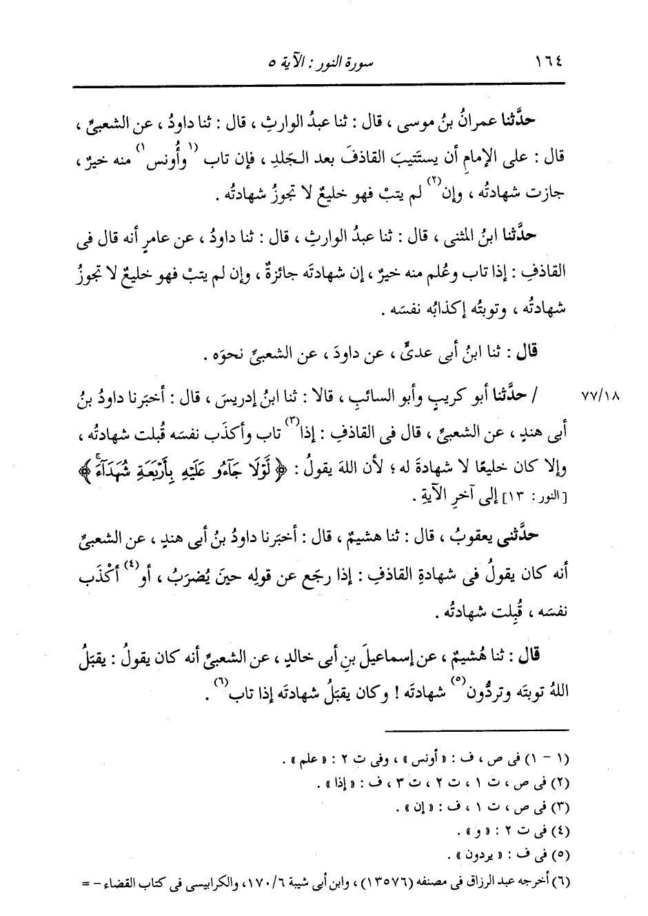 قَالَ: ثنا هُشَيْمٌ، عَنْ إِسْمَاعِيلَ بْنِ أَبِي خَالِدٍ، عَنِ الشَّعْبِيِّ أَنَّهُ كَانَ يَقُولُ: «§يَقْبَلُ اللَّهُ تَوْبَتَهُ، وَتَرُدُّونَ شَهَادَتَهُ؟ وَكَانَ يَقْبَلُ شَهَادَتَهُ إِذَا تَابَ»