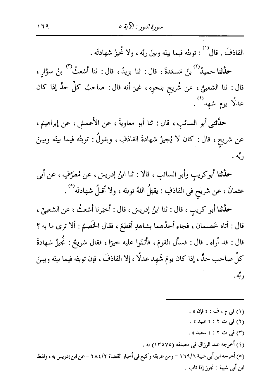 حَدَّثَنَا أَبُو كُرَيْبٍ، قَالَ: ثنا ابْنُ إِدْرِيسَ، قَالَ: أَخْبَرَنَا أَشْعَثُ، عَنِ الشَّعْبِيِّ، قَالَ: أَتَاهُ خَصْمَانِ، فَجَاءَ أَحَدُهُمَا بِشَاهِدٍ أَقْطَعَ، فَقَالَ الْخَصِمُ: أَلَا تَرَى مَا بِهِ؟ قَالَ: قَدْ أَرَاهُ. قَالَ: فَسَأَلَ الْقَوْمَ، فَأَثْنَوْا عَلَيْهِ خَيْرًا، فَقَالَ شُرَيْحٌ: «§نُجِيزُ شَهَادَةَ كُلِّ صَاحِبِ حَدٍّ، إِذَا كَانَ يَوْمَ شَهِدَ عَدْلًا إِلَّا الْقَاذِفَ، فَإِنَّ تَوْبَتَهُ فِيمَا بَيْنَهُ وَبَيْنَ رَبِّهِ» -[170]- حَدَّثَنَا أَبُو السَّائِبِ قَالَ: ثنا ابْنُ إِدْرِيسَ قَالَ: أَخْبَرَنَا أَشْعَثُ، عَنِ الشَّعْبِيِّ قَالَ: جَاءَ خَصْمَانِ إِلَى شُرَيْحٍ فَجَاءَ أَحَدُهُمَا بِبَيِّنَةٍ، فَجَاءَ بِشَاهِدٍ أَقْطَعَ، فَقَالَ الْخَصِمُ: أَلَا تَرَى إِلَى مَا بِهِ؟ فَقَالَ شُرَيْحٌ: قَدْ رَأَيْنَاهُ، وَقَدْ سَأَلْنَا الْقَوْمَ فَأَثْنَوْا خَيْرًا. ثُمَّ ذَكَرَ سَائِرَ الْحَدِيثِ، نَحْوَ حَدِيثِ أَبِي كُرَيْبٍ.