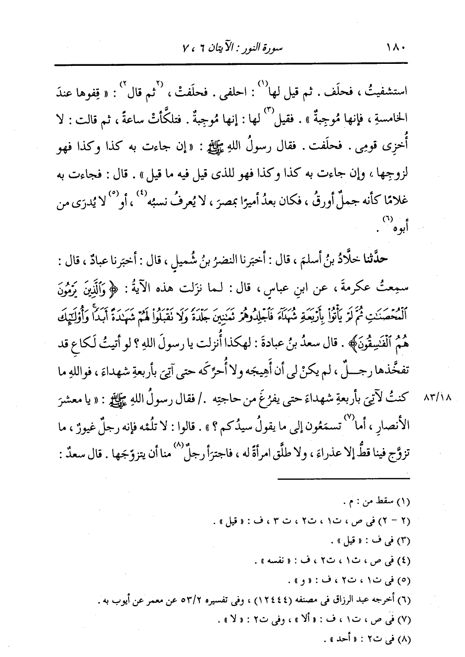 حَدَّثَنَا خَلَّادُ بْنُ أَسْلَمَ، قَالَ: أَخْبَرَنَا النَّضْرُ بْنُ شُمَيْلٍ، قَالَ: أَخْبَرَنَا عَبَّادٌ، قَالَ: سَمِعْتُ عِكْرِمَةَ، عَنِ ابْنِ عَبَّاسٍ، قَالَ: لَمَّا نَزَلَتْ هَذِهِ الْآيَةُ: {وَالَّذِينَ يَرْمُونَ الْمُحْصَنَاتِ ثُمَّ لَمْ يَأْتُوا بِأَرْبَعَةِ شُهَدَاءَ فَاجْلِدُوهُمْ ثَمَانِينَ جَلْدَةً وَلَا تَقْبَلُوا لَهُمْ شَهَادَةً أَبَدًا وَأُولَئِكَ هُمُ الْفَاسِقُونَ} [النور: 4] قَالَ سَعْدُ بْنُ عُبَادَةَ: لَهَكَذَا أُنْزِلَتْ يَا رَسُولَ اللَّهِ؟ لَوْ أَتَيْتُ لَكَاعَ قَدْ تَفَخَّذَهَا رَجُلٌ، لَمْ يَكُنْ لِي أَنْ أَهِيجَهُ وَلَا أُحَرِّكَهُ حَتَّى آتِيَ بِأَرْبَعَةِ شُهَدَاءَ؟ فَوَاللَّهِ مَا كُنْتُ لِآتِيَ بِأَرْبَعَةِ شُهَدَاءَ حَتَّى يَفْرُغَ مِنْ حَاجَتِهِ فَقَالَ رَسُولُ اللَّهِ صَلَّى اللهُ عَلَيْهِ وَسَلَّمَ: «§يَا مَعْشَرَ الْأَنْصَارِ، أَمَا تَسْمَعُونَ إِلَى مَا يَقُولُ سَيِّدُكُمْ؟» قَالُوا: لَا تَلُمْهُ , فَإِنَّهُ رَجُلٌ غَيُورٌ، مَا تَزَوَّجَ فِينَا قَطُّ إِلَّا عَذْرَاءَ , وَلَا طَلَّقَ امْرَأَةً لَهُ فَاجْتَرَأَ رَجُلٌ مِنَّا أَنْ يَتَزَوَّجُهَا قَالَ سَعْدٌ: -[181]- يَا رَسُولَ اللَّهِ، بِأَبِي وَأُمِّي، وَاللَّهِ إِنِّي لَأَعْرِفُ أَنَّهَا مِنَ اللَّهِ , وَأَنَّهَا حَقٌّ، وَلَكِنْ عَجِبْتُ لَوْ وَجَدْتُ لَكَاعَ قَدْ تَفَخَّذَهَا رَجُلٌ لَمْ يَكُنْ لِي أَنْ أُهِيجَهُ وَلَا أُحَرِّكَهُ حَتَّى آتِيَ بِأَرْبَعَةِ شُهَدَاءَ وَاللَّهِ لَا آتِيَ بِأَرْبَعَةِ شُهَدَاءَ حَتَّى يَفْرُغَ مِنْ حَاجَتِهِ فَوَاللَّهِ مَا لَبِثُوا إِلَّا يَسِيرًا حَتَّى جَاءَ هِلَالُ بْنُ أُمَيَّةَ مِنْ حَدِيقَةٍ لَهُ، فَرَأَى بِعَيْنَيْهِ، وَسَمِعَ بِأُذُنَيْهِ، فَأَمْسَكَ حَتَّى أَصْبَحَ. فَلَمَّا أَصْبَحَ غَدَا عَلَى رَسُولِ اللَّهِ صَلَّى اللهُ عَلَيْهِ وَسَلَّمَ، وَهُوَ جَالِسٌ مَعَ أَصْحَابِهِ، فَقَالَ: يَا رَسُولَ اللَّهِ إِنِّي جِئْتُ أَهْلِيَ عِشَاءً، فَوَجَدْتُ رَجُلًا مَعَ أَهْلِي، رَأَيْتُ بِعَيْنَيَّ وَسَمِعْتُ بِأُذُنَيَّ. فَكَرِهَ رَسُولُ اللَّهِ صَلَّى اللهُ عَلَيْهِ وَسَلَّمَ مَا أَتَاهُ بِهِ , وَثَقُلَ عَلَيْهِ جِدًّا، حَتَّى عُرِفَ ذَلِكَ فِي وَجْهِهِ، فَقَالَ هِلَالٌ: وَاللَّهِ يَا رَسُولَ اللَّهِ , إِنِّي لَأَرَى الْكَرَاهَةَ فِي وَجْهِكَ مِمَّا أَتَيْتُكَ بِهِ، وَاللَّهُ يَعْلَمُ أَنِّي صَادِقٌ، وَمَا قُلْتُ إِلَّا حَقًّا، فَإِنِّي لَأَرْجُو أَنْ يَجْعَلَ اللَّهُ فَرَجًا. قَالَ: وَاجْتَمَعَتِ الْأَنْصَارُ، فَقَالُوا: ابْتُلِينَا بِمَا قَالَ سَعْدٌ، أَيُجْلَدُ هِلَالُ بْنُ أُمَيَّةَ , وَتَبْطُلُ شَهَادَتُهُ فِي الْمُسْلِمِينَ؟ فَهَمَّ رَسُولُ اللَّهِ صَلَّى اللهُ عَلَيْهِ وَسَلَّمَ بِضَرْبِهِ، فَإِنَّهُ لَكَذَلِكَ يُرِيدُ أَنْ يَأْمُرَ بِضَرْبِهِ، وَرَسُولُ اللَّهِ صَلَّى اللهُ عَلَيْهِ وَسَلَّمَ جَالِسٌ مَعَ أَصْحَابِهِ، إِذْ نَزَلَ عَلَيْهِ الْوَحْي، فَأَمْسَكَ أَصْحَابُهُ عَنْ كَلَامِهِ حِينَ عَرَفُوا أَنَّ الْوَحْيَ قَدْ نَزَلَ، حَتَّى فَرَغَ، فَأَنْزَلَ اللَّهُ: {وَالَّذِينَ يَرْمُونَ أَزْوَاجَهُمْ وَلَمْ يَكُنْ لَهُمْ شُهَدَاءُ إِلَّا أَنْفُسُهُمْ} [النور: 6] . إِلَى: {أَنَّ غَضَبَ اللَّهِ عَلَيْهَا إِنْ كَانَ مِنَ الصَّادِقِينَ} [النور: 9] فَقَالَ رَسُولُ اللَّهِ صَلَّى اللهُ عَلَيْهِ وَسَلَّمَ: «أَبْشِرْ يَا هِلَالُ، فَإِنَّ اللَّهَ قَدْ جَعَلَ فَرَجًا» فَقَالَ: قَدْ كُنْتُ أَرْجُو ذَلِكَ مِنَ اللَّهِ. فَقَالَ رَسُولُ اللَّهِ صَلَّى اللهُ عَلَيْهِ وَسَلَّمَ: «أَرْسِلُوا إِلَيْهَا» فَجَاءَتْ، فَلَمَّا اجْتَمَعَا -[182]- عِنْدَ رَسُولِ اللَّهِ صَلَّى اللهُ عَلَيْهِ وَسَلَّمَ قِيلَ لَهَا، فَكَذَّبَتْ، فَقَالَ رَسُولُ اللَّهِ صَلَّى اللهُ 