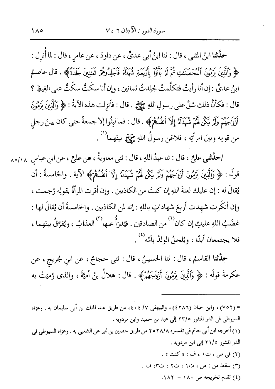 حَدَّثَنِي عَلِيُّ، قَالَ: ثنا عَبْدُ اللَّهِ، قَالَ: ثني مُعَاوِيَةُ، عَنْ عَلِيٍّ، عَنِ ابْنِ عَبَّاسٍ، قَوْلُهُ: {§وَالَّذِينَ يَرْمُونَ أَزْوَاجَهُمْ وَلَمْ يَكُنْ لَهُمْ شُهَدَاءُ إِلَّا أَنْفُسُهُمْ} [النور: 6] الْآيَةُ، وَالْخَامِسَةُ: أَنْ يُقَالَ لَهُ: إِنَّ عَلَيْكَ لَعْنَةَ اللَّهِ إِنْ كُنْتَ مِنَ الْكَاذِبِينَ. وَإِنْ أَقَرَّتِ الْمَرْأَةُ بِقَوْلِهِ رُجِمَتْ، وَإِنْ أَنْكَرَتْ شَهِدَتْ أَرْبَعَ شَهَادَاتٍ بِاللَّهِ: إِنَّهُ لَمِنَ الْكَاذِبِينَ، وَالْخَامِسَةَ أَنْ يُقَالَ لَهَا: غَضَبُ اللَّهِ عَلَيْكِ إِنْ كَانَ مِنَ الصَّادِقِينَ فَيَدْرَأُ عَنْهَا الْعَذَابَ، وَيُفَرِّقُ بَيْنَهُمَا، فَلَا يَجْتَمِعَانِ أَبَدًا، وَيُلْحَقُ الْوَلَدُ بِأُمِّهِ "