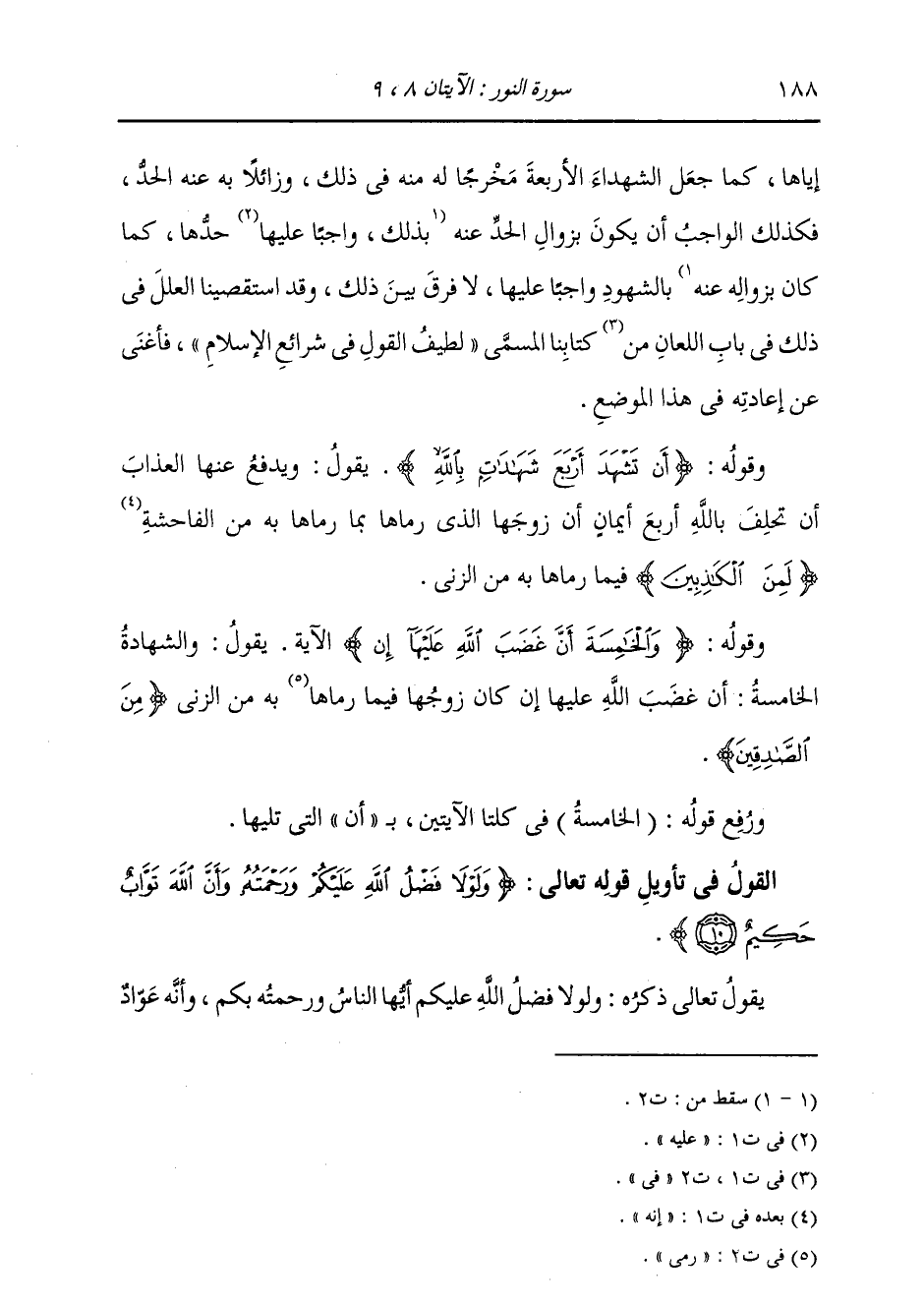 إِيَّاهَا، كَمَا جَعَلَ الشُّهَدَاءَ الْأَرْبَعَةَ مَخْرَجًا لَهُ مِنْهُ فِي ذَلِكَ وَزَائِلًا بِهِ عَنْهُ الْحَدُّ؛ فَكَذَلِكَ الْوَاجِبُ أَنْ يَكُونَ بِزَوَالِ الْحَدِّ عَنْهُ بِذَلِكَ وَاجِبًا عَلَيْهَا حَدُّهَا , كَمَا كَانَ بِزَوَالِهِ عَنْهُ بِالشُّهُودِ وَاجِبًا عَلَيْهَا، لَا فَرْقَ بَيْنَ ذَلِكَ. وَقَدِ اسْتَقْصَيْنَا الْعِلَلَ فِي ذَلِكَ فِي بَابِ اللِّعَانِ مِنْ كِتَابِنَا الْمُسَمَّى (لَطِيفُ الْقَوْلِ فِي شَرَائِعِ الْإِسْلَامِ "، فَأَغْنَى عَنْ إِعَادَتِهِ فِي هَذَا الْمَوْضِعِ