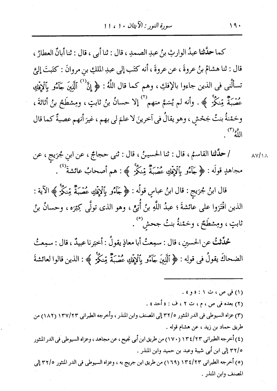 حُدِّثْتُ عَنِ الْحُسَيْنِ، قَالَ: سَمِعْتُ أَبَا مُعَاذٍ، يَقُولُ: أَخْبَرَنَا عُبَيْدٌ، قَالَ: سَمِعْتُ الضَّحَّاكَ، يَقُولُ فِي قَوْلِهِ: {§الَّذِينَ جَاءُوا بِالْإِفْكِ عُصْبَةٌ مِنْكُمْ} الَّذِينَ قَالُوا لِعَائِشَةَ -[191]- الْإِفْكَ وَالْبُهْتَانَ "