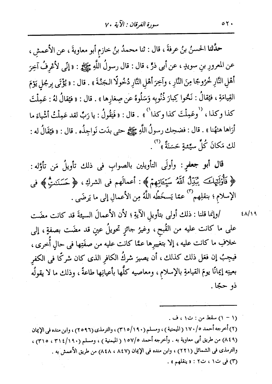 حَدَّثَنَا الْحَسَنُ بْنُ عَرَفَةَ، قَالَ: ثنا مُحَمَّدُ بْنُ خَازِمٍ أَبُو مُعَاوِيَةَ، عَنِ الْأَعْمَشِ، عَنِ الْمَعْرُورِ بْنِ سُوَيْدٍ، عَنْ أَبِي ذَرٍّ، قَالَ: قَالَ رَسُولُ اللَّهِ صَلَّى اللهُ عَلَيْهِ وَسَلَّمَ: " إِنِّي لَأَعْرِفُ آخِرَ أَهْلِ النَّارِ خُرُوجًا مِنَ النَّارِ , وَآخَرَ أَهْلِ النَّارِ دُخُولًا الْجَنَّةَ , قَالَ: §يُؤْتَى بِرَجُلٍ يَوْمَ الْقِيَامَةِ فَيُقَالُ: نَحُّوا كِبَارَ ذُنُوبِهِ وَسَلُوهُ عَنْ صِغَارِهَا , قَالَ: فَيُقَالُ لَهُ: عَمِلْتَ كَذَا وَكَذَا , وَعَمِلْتَ كَذَا وَكَذَا , قَالَ: فَيَقُولُ: يَا رَبِّ، لَقَدْ عَمِلْتُ أَشْيَاءَ مَا أَرَاهَا هَا هُنَا , قَالَ: فَضَحِكَ رَسُولُ اللَّهِ صَلَّى اللهُ عَلَيْهِ وَسَلَّمَ حَتَّى بَدَتْ نَوَاجِذُهُ , قَالَ: فَيُقَالُ لَهُ: لَكَ مَكَانَ كُلِّ سَيِّئَةٍ حَسَنَةً ". قَالَ أَبُو جَعْفَرٍ: وَأَوْلَى التَّأْوِيلَيْنِ بِالصَّوَابِ فِي ذَلِكَ تَأْوِيلُ مَنْ تَأَوَّلَهُ: فَأُولَئِكَ يُبَدِّلُ اللَّهُ سَيِّئَاتِهِمْ: أَعْمَالَهُمْ فِي الشِّرْكِ حَسَنَاتٍ فِي الْإِسْلَامِ , بِنَقْلِهِمْ عَمَّا يَسْخَطُهُ اللَّهُ مِنَ الْأَعْمَالِ إِلَى مَا يَرْضَى. وَإِنَّمَا قُلْنَا ذَلِكَ أَوْلَى بِتَأْوِيلِ الْآيَةِ , لِأَنَّ الْأَعْمَالَ السَّيِّئَةَ قَدْ كَانَتْ مَضَتْ عَلَى مَا كَانَتْ عَلَيْهِ مِنَ الْقُبْحِ , وَغَيْرُ جَائِزٍ تَحْوِيلُ عَيْنٍ قَدْ مَضَتْ بِصِفَةٍ إِلَى خِلَافِ مَا كَانَتْ عَلَيْهِ , إِلَّا بِتَغْيِيرِهَا عَمَّا كَانَتْ عَلَيْهِ مِنْ صِفَتِهَا فِي حَالٍ أُخْرَى , فَيَجِبُ إِنْ فُعِلَ ذَلِكَ كَذَلِكَ أَنْ يَصِيرَ شِرْكَ الْكَافِرِ الَّذِي كَانَ شِرْكًا فِي الْكُفْرِ بِعَيْنِهِ إِيمَانًا يَوْمَ الْقِيَامَةِ بِالْإِسْلَامِ وَمَعَاصِيهِ كُلِّهَا بِأَعْيَانِهَا طَاعَةً , وَذَلِكَ مَا لَا يَقُولُهُ ذُو حِجًا