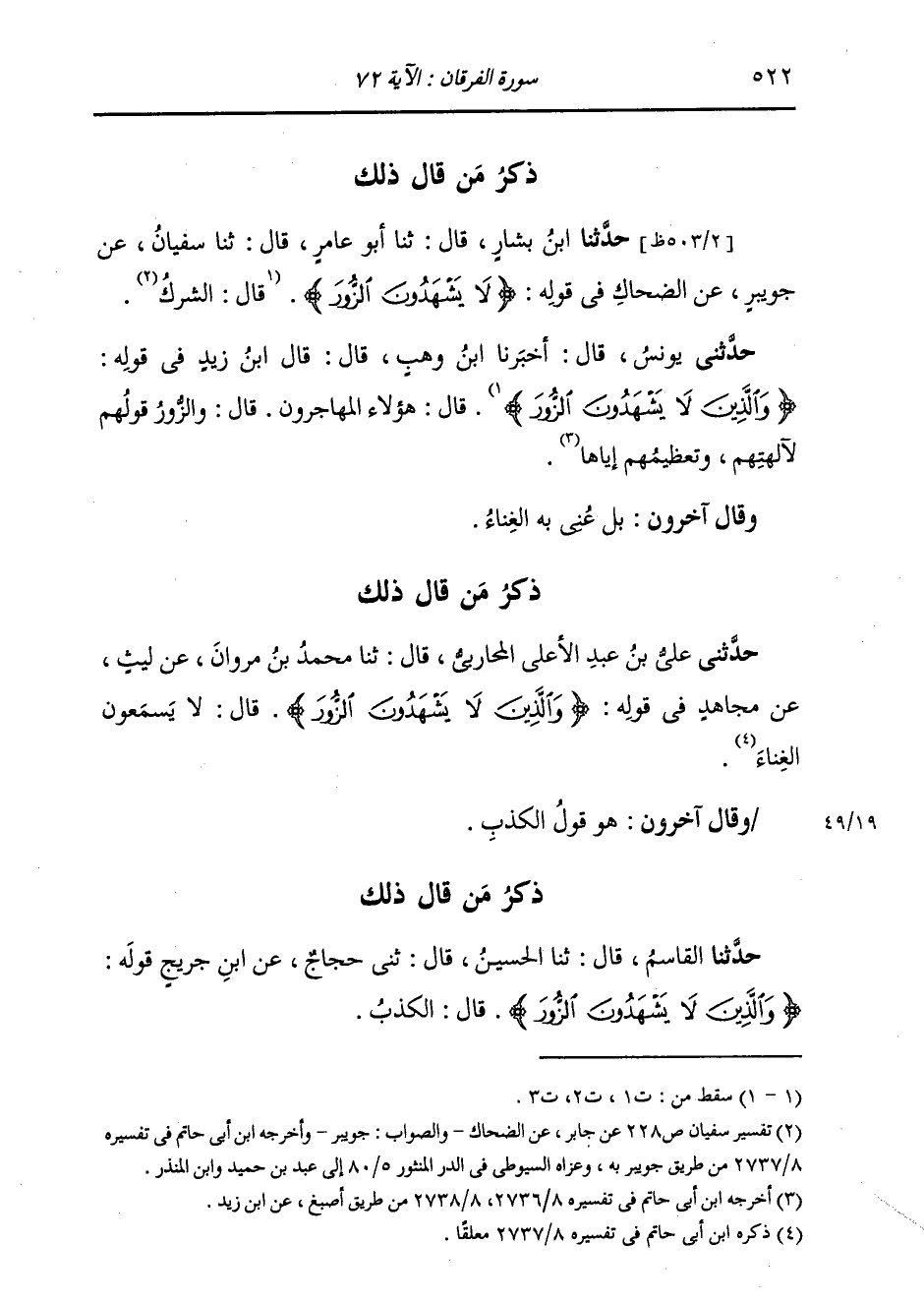 حَدَّثَنِي يُونُسُ، قَالَ: أَخْبَرَنَا ابْنُ وَهْبٍ، قَالَ: قَالَ ابْنُ زَيْدٍ , فِي قَوْلِهِ: " {§وَالَّذِينَ لَا يَشْهَدُونَ الزُّورَ} [الفرقان: 72] قَالَ: هَؤُلَاءِ الْمُهَاجِرُونِ , قَالَ: وَالزُّورُ قَوْلُهُمْ لِآلِهَتِهِمْ وَتَعْظِيمُهُمْ إِيَّاهَا ". وَقَالَ آخَرُونَ: بَلْ عُنِيَ بِهِ الْغِنَاءَ