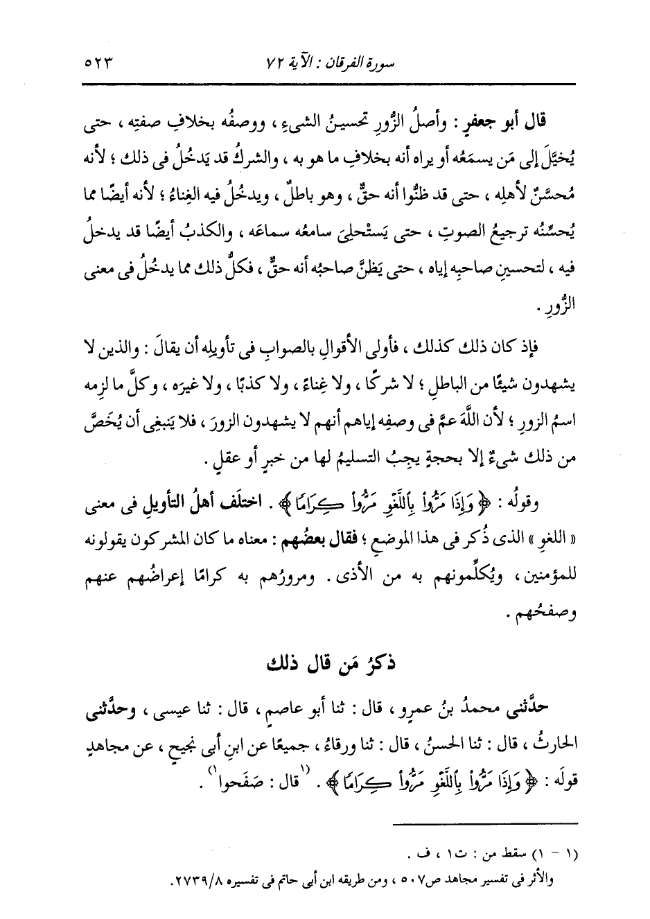 قَالَ أَبُو جَعْفَرٍ: وَأَصْلُ الزُّورِ تَحْسِينُ الشَّيْءِ , وَوَصَفُهُ بِخِلَافِ صِفَتِهِ , حَتَّى يُخَيَّلَ إِلَى مَنْ يَسْمَعُهُ أَوْ يَرَاهُ أَنَّهُ خِلَافَ مَا هُوَ بِهِ , وَالشِّرْكُ قَدْ يَدْخُلُ فِي ذَلِكَ , لِأَنَّهُ مُحَسَّنٌ لِأَهْلِهِ , حَتَّى قَدْ ظَنُّوا أَنَّهُ حَقٌّ , وَهُوَ بَاطِلٌ , وَيَدْخُلُ فِيهِ الْغِنَاءُ , لِأَنَّهُ أَيْضًا مِمَّا يُحَسِّنُهُ تَرْجِيعُ الصَّوْتِ , حَتَّى يَسْتَحْلِيَ سَامِعُهُ سَمَاعَهُ , وَالْكَذِبُ أَيْضًا قَدْ يَدْخُلُ فِيهِ , لِتَحْسِينِ صَاحِبِهِ إِيَّاهُ , حَتَّى يُظِنَّ صَاحِبَهُ أَنَّهُ حَقٌّ , فَكُلُّ ذَلِكَ مِمَّا يَدْخُلُ فِي مَعْنَى الزُّورِ. فَإِذَا كَانَ ذَلِكَ كَذَلِكَ , فَأَوْلَى الْأَقْوَالِ بِالصَّوَابِ فِي تَأْوِيلِهِ أَنْ يُقَالَ: وَالَّذِينَ لَا يَشْهَدُونَ شَيْئًا مِنَ الْبَاطِلِ , لَا شِرْكًا , وَلَا غِنَاءً , وَلَا كَذِبًا وَلَا غَيْرَهُ , وَكُلُّ مَا لَزِمَهُ اسْمُ الزُّورِ , لِأَنَّ اللَّهَ عَمَّ فِي وَصَفِهِ إِيَّاهُمْ , أَنَّهُمْ لَا يَشْهَدُونَ الزُّورَ , فَلَا يَنْبَغِي أَنْ يُخَصَّ مِنْ ذَلِكَ شَيْءٌ إِلَّا بِحَجَّةٍ يَجِبُ التَّسْلِيمُ لَهَا , مِنْ خَبَرٍ أَوْ عَقْلٍ