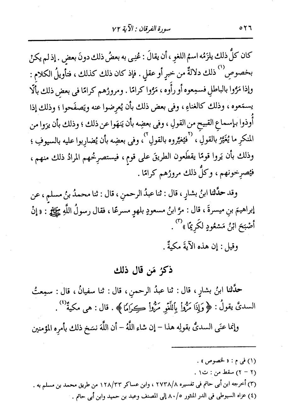 ذِكْرُ مَنْ قَالَ ذَلِكَ: حَدَّثَنَا ابْنُ بَشَّارٍ، قَالَ: ثنا عَبْدُ الرَّحْمَنِ، قَالَ: ثنا سُفْيَانُ، قَالَ: سَمِعْتُ السُّدِّيَّ، يَقُولُ: " {§وَإِذَا مَرُّوا بِاللَّغْوِ مَرُّوا كِرَامًا} [الفرقان: 72] قَالَ: هِيَ مَكِّيَّةٌ ". وَإِنَّمَا عَنِيَ السُّدِّيُّ بِقَوْلِهِ هَذَا إِنْ شَاءَ اللَّهُ , أَنَّ اللَّهَ نَسَخَ ذَلِكَ بِأَمْرِهِ الْمُؤْمِنِينَ -[527]- بِقِتَالِ الْمُشْرِكِينَ بِقَوْلِهِ: {فَاقْتُلُوا الْمُشْرِكِينَ حَيْثُ وَجَدْتُمُوهُمْ} [التوبة: 5] وَأَمَرَهُمْ إِذَا مَرُّوا بِاللَّغْوِ الَّذِي هُوَ شِرْكٌ أَنْ يُقَاتِلُوا أُمَرَاءَهُ , وَإِذَا مَرُّوا بِاللَّغْوِ الَّذِي هُوَ مَعْصِيَةٌ لِلَّهِ أَنْ يُغَيِّرُوهُ , وَلَمْ يَكُونُوا أُمِرُوا بِذَلِكَ بِمَكَّةَ , وَهَذَا الْقَوْلُ نَظِيرُ تَأْوِيلِنَا الَّذِي تَأَوَّلْنَاهُ فِي ذَلِكَ