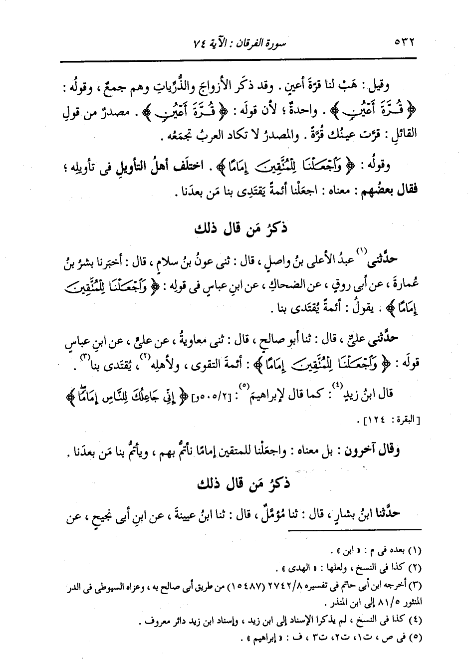 §وَقَوْلُهُ: {وَاجْعَلْنَا لِلْمُتَّقِينَ إِمَامًا} [الفرقان: 74] اخْتَلَفَ أَهْلُ التَّأْوِيلَ فِي تَأْوِيلِهِ , فَقَالَ بَعْضُهُمْ: مَعْنَاهُ: اجْعَلْنَا أئِمَّةً يَقْتَدِي بِنَا مَنْ بَعْدَنَا