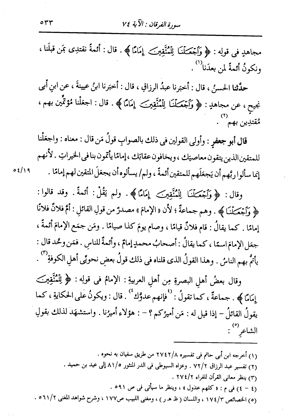 حَدَّثَنَا الْحَسَنُ، قَالَ: أَخْبَرَنَا عَبْدُ الرَّزَّاقِ، قَالَ: أَخْبَرَنَا ابْنُ عُيَيْنَةَ، عَنِ ابْنِ أَبِي نَجِيحٍ، عَنْ مُجَاهِدٍ: " {§وَاجْعَلْنَا لِلْمُتَّقِينَ إِمَامًا} [الفرقان: 74] قَالَ: اجْعَلْنَا مُؤْتَمِّينَ بِهِمْ , مُقْتَدِينَ بِهِمْ ". قَالَ أَبُو جَعْفَرٍ: وَأَوْلَى الْقَوْلَيْنِ فِي ذَلِكَ بِالصَّوَابِ قَوْلُ مَنْ قَالَ: مَعْنَاهُ وَاجْعَلْنَا لِلْمُتَّقِينَ الَّذِينَ يَتَّقُونَ مَعَاصِيكَ , وَيَخَافُونَ عِقَابُكَ إِمَامًا يَأْتَمُّونَ بِنَا فِي الْخَيْرَاتِ , لِأَنَّهُمْ إِنَّمَا سَأَلُوا رَبَّهُمْ أَنْ يَجْعَلَهُمْ لِلْمُتَّقِينَ أَئِمَّةً , وَلَمْ يَسْأَلُوهُ أَنْ يَجْعَلَ الْمُتَّقِينَ لَهُمْ إِمَامًا , وَقَالَ {وَاجْعَلْنَا لِلْمُتَّقِينَ إِمَامًا} [الفرقان: 74] وَلَمْ يَقُلْ أَئِمَّةً. وَقَدْ قَالُوا: وَاجْعَلْنَا وَهُمْ جَمَاعَةٌ , لِأَنَّ الْإِمَامَ مَصْدَرٌ مِنْ قَوْلِ الْقَائِلِ: أَمَّ فُلَانٌ فُلَانًا إِمَامًا , كَمَا يُقَالُ: قَامَ فُلَانٌ قِيَامًا , وَصَامَ يَوْمَ كَذَا صِيَامًا. وَمَنْ جَمَعَ الْإِمَامَ أَئِمَّةً جَعَلَ الْإِمَامَ اسْمًا , كَمَا يُقَالُ: أَصْحَابُ مُحَمَّدٍ إِمَامٌ , وَأَئِمَّةٌ لِلنَّاسِ. فَمَنْ وَحَّدَ قَالَ: يَأْتَمُّ بِهِمُ النَّاسُ. وَهَذَا الْقَوْلُ الَّذِي قُلْنَاهُ فِي ذَلِكَ قَوْلُ بَعْضِ نَحْوِيِّي أَهْلِ الْكُوفَةِ. وَقَالَ بَعْضُ أَهْلِ الْبَصْرَةِ مِنْ أَهْلِ الْعَرَبِيَّةِ: الْإِمَامُ فِي قَوْلِهِ: {لِلْمُتَّقِينَ إِمَامًا} [الفرقان: 74] جَمَاعَةٌ , كَمَا تَقُولُ: كُلُّهُمْ عُدُولٌ. قَالَ: وَيَكُونُ عَلَى الْحِكَايَةَ , كَمَا يَقُولُ الْقَائِلُ إِذَا قِيلَ لَهُ: مَنْ أَمِيرُكُمْ: هَؤُلَاءِ أَمِيرُنَا. وَاسْتَشْهَدَ لِذَلِكَ بِقَوْلِ الشَّاعِرِ: