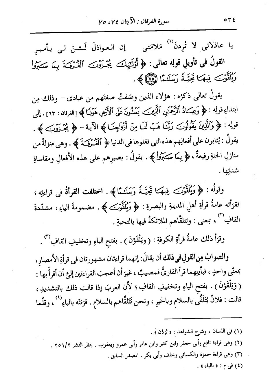 §وَقَوْلُهُ: {وَيُلَقَّوْنَ فِيهَا تَحِيَّةً وَسَلَامًا} [الفرقان: 75] اخْتَلَفَتِ الْقُرَّاءُ فِي قِرَاءَتِهِ , فَقَرَأَتْهُ عَامَّةُ قُرَّاءِ أَهْلِ الْمَدِينَةِ وَالْبَصْرَةِ: {وَيُلَقَّوْنَ} [الفرقان: 75] مَضْمُومَةَ الْيَاءِ , مُشَدَّدَةَ الْقَافِ , بِمَعْنَى: وَتَتَلَقَّاهُمُ الْمَلَائِكَةُ فِيهَا بِالتَحِيَّةِ. وَقَرَأَ ذَلِكَ عَامَّةُ قُرَّاءِ الْكُوفَةِ: (وَيَلْقَوْنَ) ، بِفَتْحِ الْيَاءِ وَتَخْفِيفِ الْقَافِ. وَالصَّوَابُ مِنَ الْقَوْلِ فِي ذَلِكَ أَنْ يُقَالَ: إِنَّهُمَا قِرَاءَتَانِ مَشْهُورَتَانِ فِي قِرَاءَةِ الْأَمْصَارِ , بِمَعْنًى وَاحِدٍ , فَبِأَيَّتِهِمَا قَرَأَ الْقَارِئُ فَمُصِيبٌ , غَيْرَ أَنَّ أَعْجَبَ الْقِرَاءَتَيْنِ إِلَيَّ أَنْ أَقْرَأَ بِهَا (وَيَلْقَوْنَ) فِيهَا، بِفَتْحِ الْيَاءِ وَتَخْفِيفِ الْقَافِ , لِأَنَّ الْعَرَبَ إِذَا قَالَتْ ذَلِكَ بِالتَّشْدِيدِ قَالَتْ: فُلَانٌ يُتَلَقَّى بِالسَّلَامِ وَبِالْخَيْرِ , وَنَحْنُ نَتَلَقَّاهُمْ بِالسَّلَامِ , قَرَنَتْهُ بِالْيَاءِ , وَقَلَّمَا
