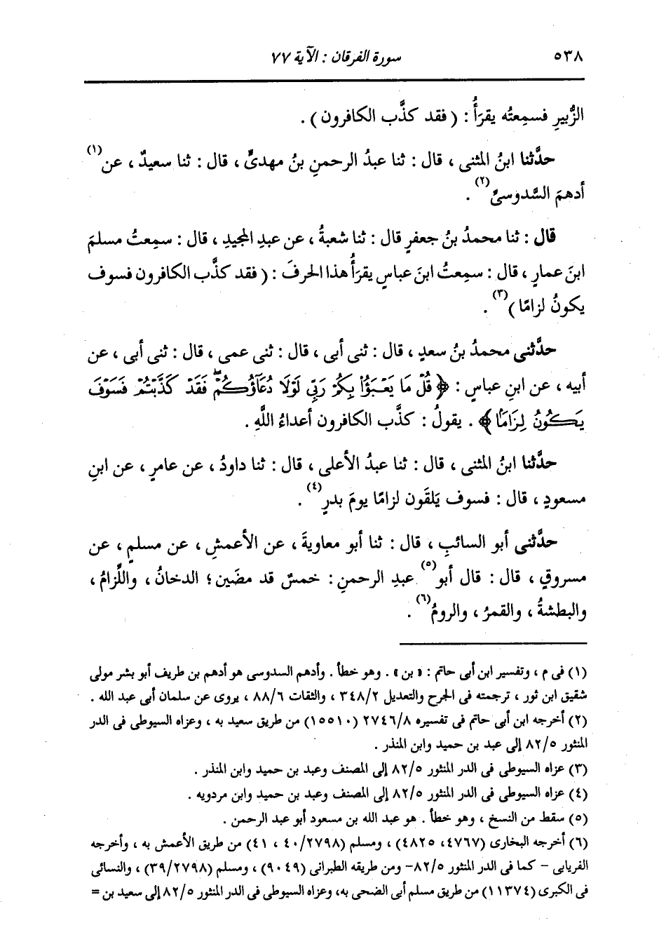 حَدَّثَنَا ابْنُ الْمُثَنَّى، قَالَ: ثنا عَبْدُ الرَّحْمَنِ بْنُ مَهْدِيٍّ، قَالَ: ثنا سَعِيدُ بْنُ أَدْهَمَ السَّدُوسِيُّ، قَالَ: ثنا مُحَمَّدُ بْنُ جَعْفَرٍ، قَالَ: ثنا شُعْبَةُ، عَنْ عَبْدِ الْمَجِيدِ، قَالَ: سَمِعْتُ مُسْلِمَ بْنَ عَمَّارٍ، قَالَ: سَمِعْتُ ابْنَ عَبَّاسٍ، يَقْرَأُ هَذَا الْحَرْفَ: (§فَقَدْ كَذَّبَ الْكَافِرُونَ) {فَسَوْفَ يَكُونُ لِزَامًا} [الفرقان: 77] "