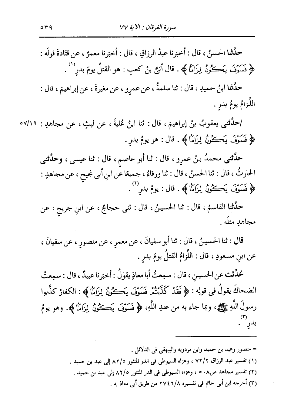 حَدَّثَنِي مُحَمَّدُ بْنُ عَمْرٍو، قَالَ: ثنا أَبُو عَاصِمٍ، قَالَ: ثنا عِيسَى؛ وَحَدَّثَنِي الْحَارِثُ، قَالَ: ثنا الْحَسَنُ، قَالَ: ثنا وَرْقَاءُ جَمِيعًا، عَنِ ابْنِ أَبِي نَجِيحٍ، عَنْ مُجَاهِدِ: " {§فَسَوْفَ يَكُونُ لِزَامًا} [الفرقان: 77] قَالَ: يَوْمُ بَدْرٍ ". حَدَّثَنَا الْقَاسِمُ، قَالَ: ثنا الْحُسَيْنُ، قَالَ: ثني حَجَّاجٌ، عَنِ ابْنِ جُرَيْجٍ، عَنْ مُجَاهِدٍ، مِثْلَهُ