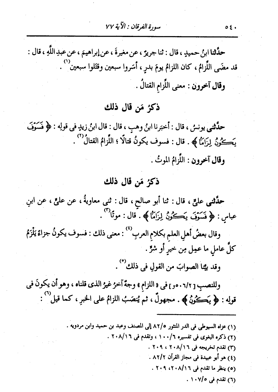ذِكْرُ مَنْ قَالَ ذَلِكَ: حَدَّثَنِي عَلِيٌّ، قَالَ: ثنا أَبُو صَالِحٍ، قَالَ: ثني مُعَاوِيَةُ، عَنْ عَلِيٍّ، عَنِ ابْنِ عَبَّاسٍ: " {§فَسَوْفَ يَكُونُ لِزَامًا} [الفرقان: 77] قَالَ: مَوْتًا ". وَقَالَ بَعْضُ أَهْلِ الْعِلْمِ بِكَلَامِ الْعَرَبِ: مَعْنَى ذَلِكَ: فَسَوْفَ يَكُونُ جَزَاءً يَلْزَمُ كُلَّ عَامَلٍ مَا عَمِلَ مِنْ خَيْرٍ أَوْ شَرٍّ وَقَدْ بَيَّنَّا الصَّوَابَ مِنَ الْقَوْلِ فِي ذَلِكَ. وَلِلنَّصْبِ فِي اللِّزَامِ وَجْهٌ آخَرُ غَيْرَ الَّذِي قُلْنَاهُ، وَهُوَ أَنْ يَكُونَ فِي قَوْلِهِ {يَكُونُ} [الفرقان: 77] مَجْهُولٌ، ثُمَّ يُنْصَبُ اللِّزَامُ عَلَى الْخَبَرِ كَمَا قِيلَ: