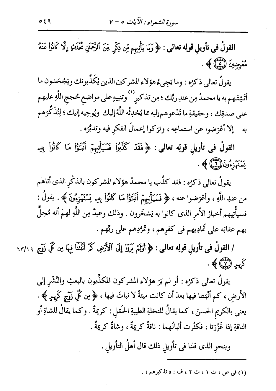 §الْقَوْلُ فِي تَأْوِيلِ قَوْلِهِ تَعَالَى: {أَوَلَمْ يَرَوْا إِلَى الْأَرْضِ كَمْ أَنْبَتْنَا فِيهَا مِنْ كُلِّ زَوْجٍ كَرِيمٍ} [الشعراء: 7] يَقُولُ تَعَالَى ذِكْرُهُ: أَوَلَمْ يَرَ هَؤُلَاءِ الْمُشْرِكُونَ الْمُكَذِّبُونَ بِالْبَعْثِ وَالنَّشْرُ إِلَى الْأَرْضِ، كَمْ أَنْبَتْنَا فِيهَا بَعْدَ أَنْ كَانَتْ مَيْتَةً لَا نَبَاتَ فِيهَا {مِنْ كُلِّ زَوْجٍ كَرِيمٍ} [الشعراء: 7] يَعْنِي بِالْكَرِيمِ: الْحَسَنَ، كَمَا يُقَالُ لِلنَّخْلَةِ الطَّيِّبَةِ الْحَمْلِ: كَرِيمَةٌ، وَكَمَا يُقَالُ لِلشَّاةِ أَوِ النَّاقَةِ إِذَا غَزَرَتَا فَكَثُرَتْ أَلْبَانُهُمَا: نَاقَةٌ كَرِيمَةٌ، وَشَاةٌ كَرِيمَةٌ. وَبِنَحْوِ الَّذِي قُلْنَا فِي تَأْوِيلِ ذَلِكَ قَالَ أَهْلُ التَّأْوِيلِ