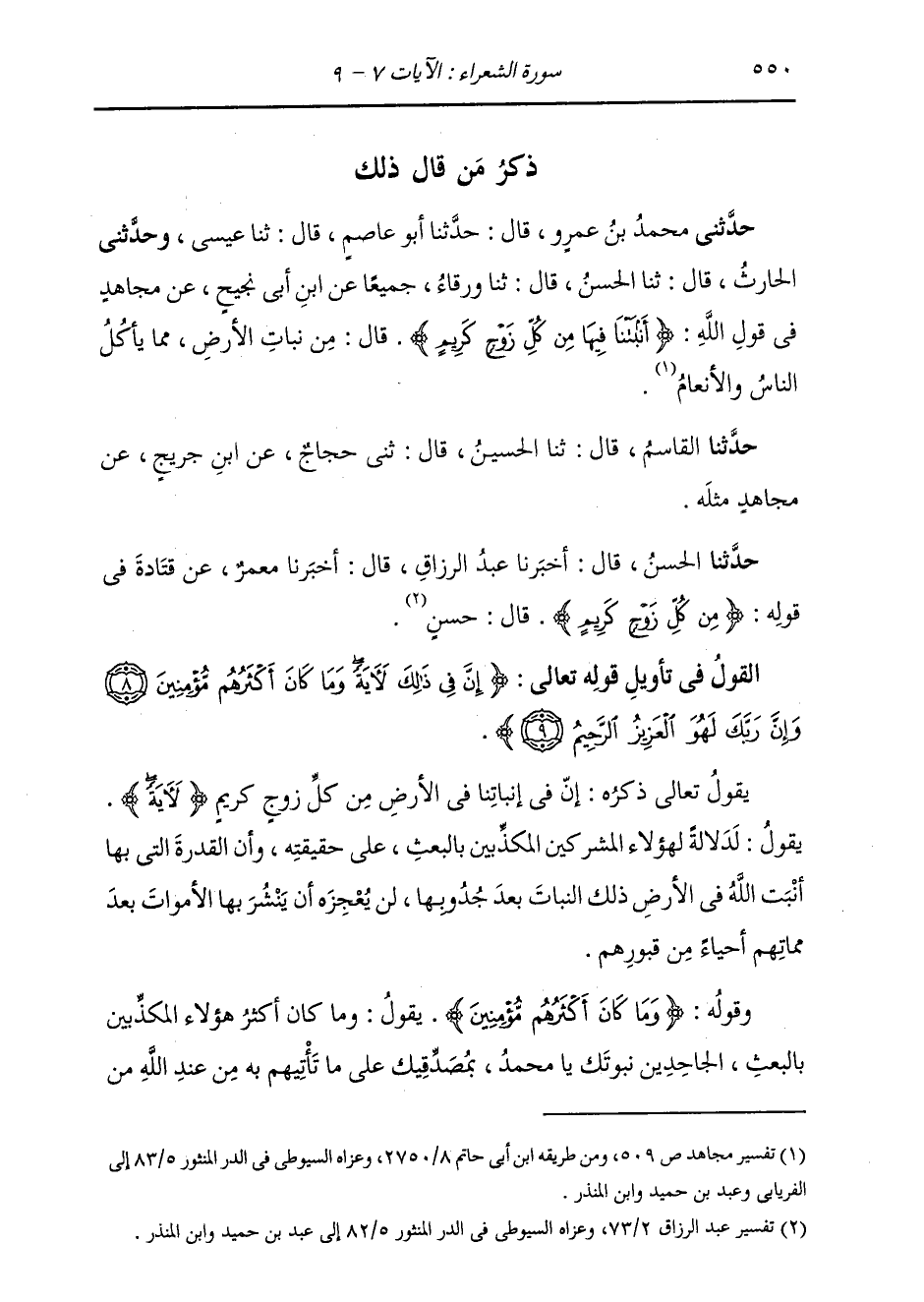 ذِكْرُ مَنْ قَالَ ذَلِكَ: حَدَّثَنِي مُحَمَّدُ بْنُ عَمْرٍو، قَالَ: ثني أَبُو عَاصِمٍ، قَالَ: ثنا عِيسَى، وَحَدَّثَنِي الْحَارِثُ، قَالَ: ثنا الْحَسَنُ، قَالَ: ثنا وَرْقَاءُ، جَمِيعًا، عَنِ ابْنِ أَبِي نَجِيحٍ، عَنْ مُجَاهِدٍ، فِي قَوْلِ اللَّهِ: " {§أَنْبَتْنَا فِيهَا مِنْ كُلِّ زَوْجٍ كَرِيمٍ} [الشعراء: 7] قَالَ: مِنْ نَبَاتِ الْأَرْضِ، مِمَّا تَأْكُلُ النَّاسُ وَالْأَنْعَامُ ". حَدَّثَنَا الْقَاسِمُ، قَالَ: ثنا الْحُسَيْنُ، قَالَ: ثني حَجَّاجٌ، عَنِ ابْنِ جُرَيْجٍ، عَنْ مُجَاهِدٍ، مِثْلَهُ