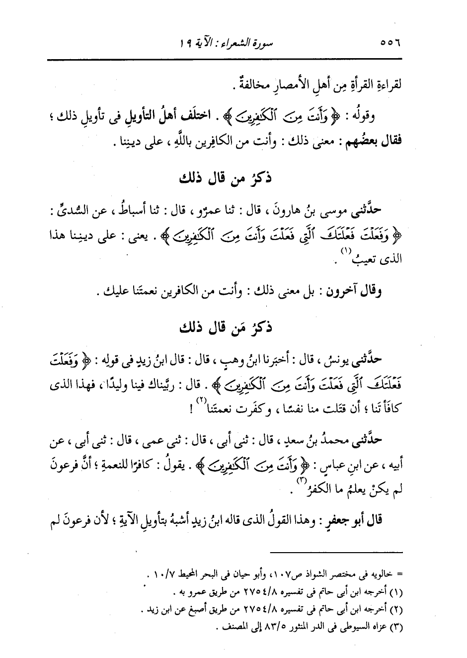 §وَقَوْلُهُ: {وَأَنْتَ مِنَ الْكَافِرِينَ} [الشعراء: 19] اخْتَلَفَ أَهْلُ التَّأْوِيلِ فِي تَأْوِيلِ ذَلِكَ، فَقَالَ بَعْضُهُمْ: مَعْنَى ذَلِكَ: وَأَنْتَ مِنَ الْكَافِرِينَ بِاللَّهِ عَلَى دِينِنَا