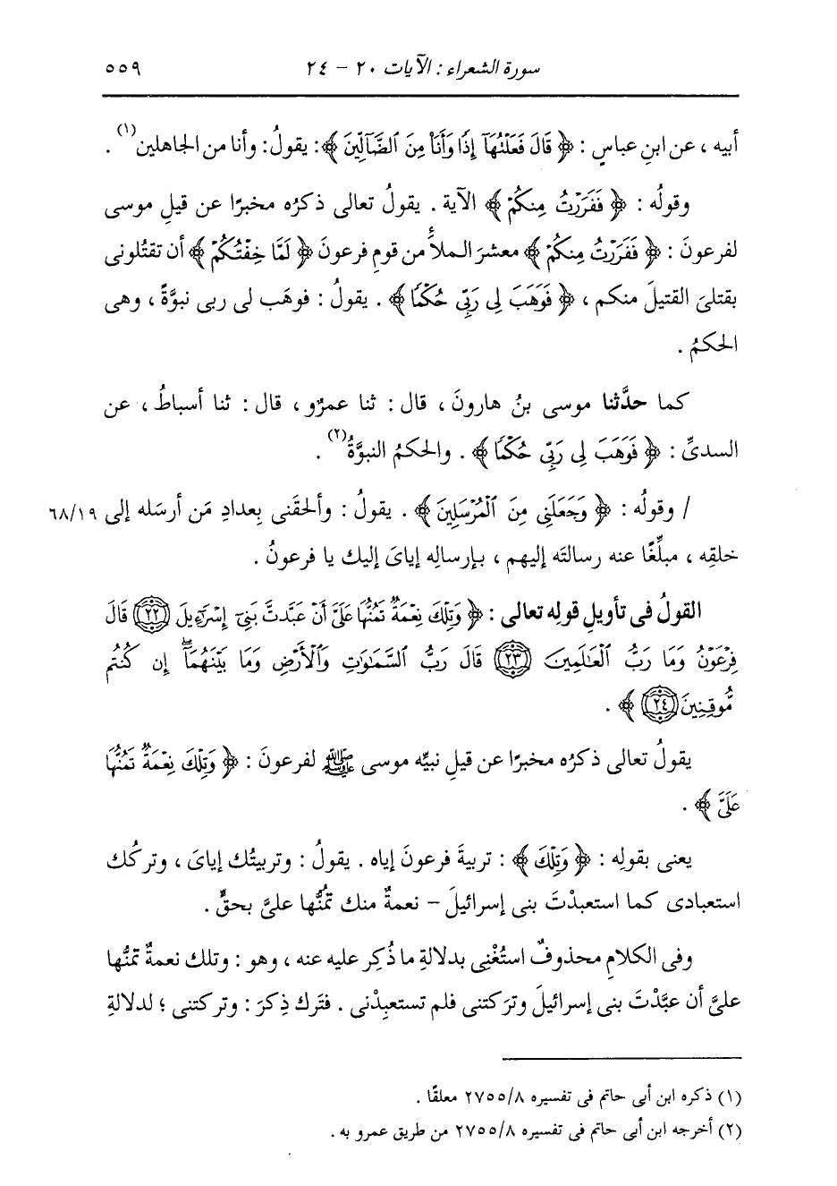 §الْقَوْلُ فِي تَأْوِيلِ قَوْلِهِ تَعَالَى: {وَتِلْكَ نِعْمَةٌ تَمُنُّهَا عَلَيَّ أَنْ عَبَّدْتَ بَنِي إِسْرَائِيلَ قَالَ فِرْعَوْنُ وَمَا رَبُّ الْعَالَمِينَ قَالَ رَبُّ السَّمَوَاتِ وَالْأَرْضِ وَمَا بَيْنَهُمَا إنْ كُنتُمْ مُوقِنِينَ} يَقُولُ تَعَالَى ذِكْرُهُ مُخْبِرًا عَنْ قِيلِ نَبِيِّهِ مُوسَى صَلَّى اللهُ عَلَيْهِ وَسَلَّمَ لِفِرْعَوْنَ {وَتِلْكَ نِعْمَةٌ تَمُنُّهَا عَلَيَّ} [الشعراء: 22] يَعْنِي بِقَوْلِهِ: وَتِلْكَ تَرْبِيَةُ فِرْعَوْنَ إِيَّاهُ، يَقُولُ: وُتَرْبِيَتُكَ إِيَّايَ، وَتَرْكُكَ اسْتِعْبَادِي كَمَا اسْتَعْبَدْتَ بَنِي إِسْرَائِيلَ نِعْمَةٌ مِنْكَ تَمُنُّهَا عَلَيَّ بِحَقٍّ. وَفِي الْكَلَامِ مَحْذُوفٌ اسْتَغْنَى بِدَلَالَةِ مَا ذُكِرَ عَلَيْهِ عَنْهُ، وَهُوَ: وَتِلْكَ نِعْمَةٌ تَمُنُّهَا عَلَيَّ أَنْ عَبَّدْتَ بَنِي إِسْرَائِيلَ وَتَرَكْتَنِي، فَلَمْ تَسْتَعْبِدْنِي، فَتَرَكَ ذِكْرَ «وَتَرَكْتَنِي» لِدَلَالَةِ