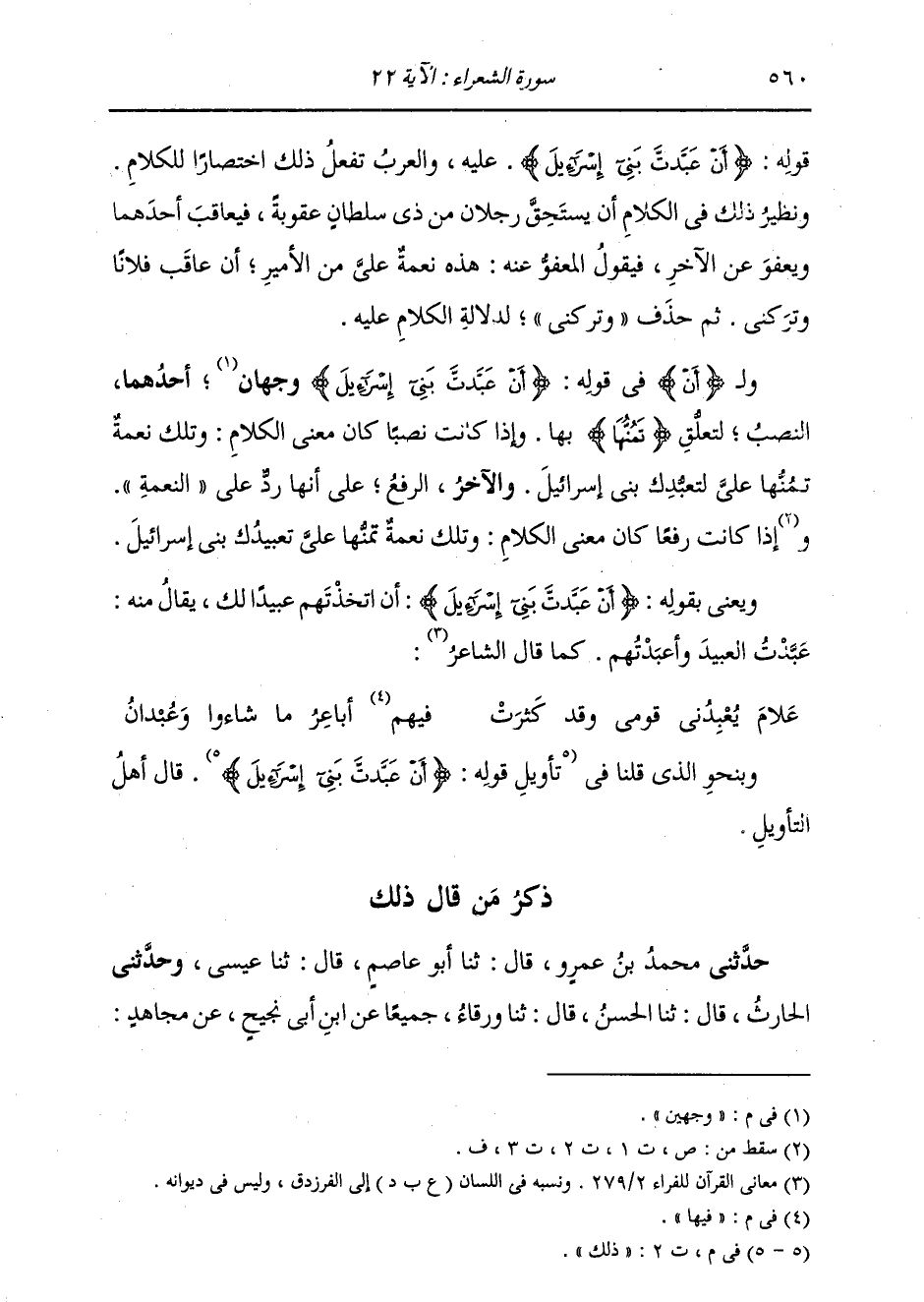 قَوْلِهِ {أَنْ عَبَّدْتَ بَنِي إِسْرَائِيلَ} [الشعراء: 22] عَلَيْهِ، وَالْعَرَبُ تَفْعَلُ ذَلِكَ اخْتِصَارًا لِلْكَلَامِ، وَنَظِيرُ ذَلِكَ فِي الْكَلَامِ أَنْ يَسْتَحِقَّ رَجُلَانِ مِنْ ذِي سُلْطَانٍ عُقُوبَةً، فَيُعَاقِبُ أَحَدَهُمَا، وَيَعْفُو عَنِ الْآخَرِ، فَيَقُولُ الْمَعْفُوُّ عَنْهُ هَذِهِ نِعْمَةٌ عَلَيَّ مِنَ الْأَمِيرِ أَنْ عَاقَبَ فُلَانًا، وَتَرَكَنِي، ثُمَّ حَذَفَ «وَتَرَكَنِي» لِدَلَالَةِ الْكَلَامِ عَلَيْهِ، وَلِأَنَّ فِي قَوْلِهِ: {أَنْ عَبَّدْتَ بَنِي إِسْرَائِيلَ} [الشعراء: 22] وَجْهَيْنِ: أَحَدُهُمَا النَّصَبُ، لِتَعَلُّقِ {تَمُنُّهَا} [الشعراء: 22] بِهَا، وَإِذَا كَانَتْ نَصَبًا كَانَ مَعْنَى الْكَلَامِ: وَتِلْكَ نِعْمَةٌ تَمُنُّهَا عَلَيَّ لِتَعَبُّدِكَ بَنِي إِسْرَائِيلَ. وَالْآخَرُ: الرَّفْعُ عَلَى أَنَّهَا رَدٌّ عَلَى النِّعْمَةِ. وَإِذَا كَانَتْ رَفْعًا كَانَ مَعْنَى الْكَلَامِ: وَتِلْكَ نِعْمَةٌ تَمُنُّهَا عَلَيَّ تَعْبِيدُكَ بَنِي إِسْرَائِيلَ. وَيَعْنِي بِقَوْلِهِ: {أَنْ عَبَّدْتَ بَنِي إِسْرَائِيلَ} [الشعراء: 22] أَنِ اتَّخَذْتَهُمْ عَبِيدًا لَكَ. يُقَالُ مِنْهُ: عَبَّدْتَ الْعَبِيدَ وَأَعْبَدْتَهُمْ، قَالَ الشَّاعِرُ: